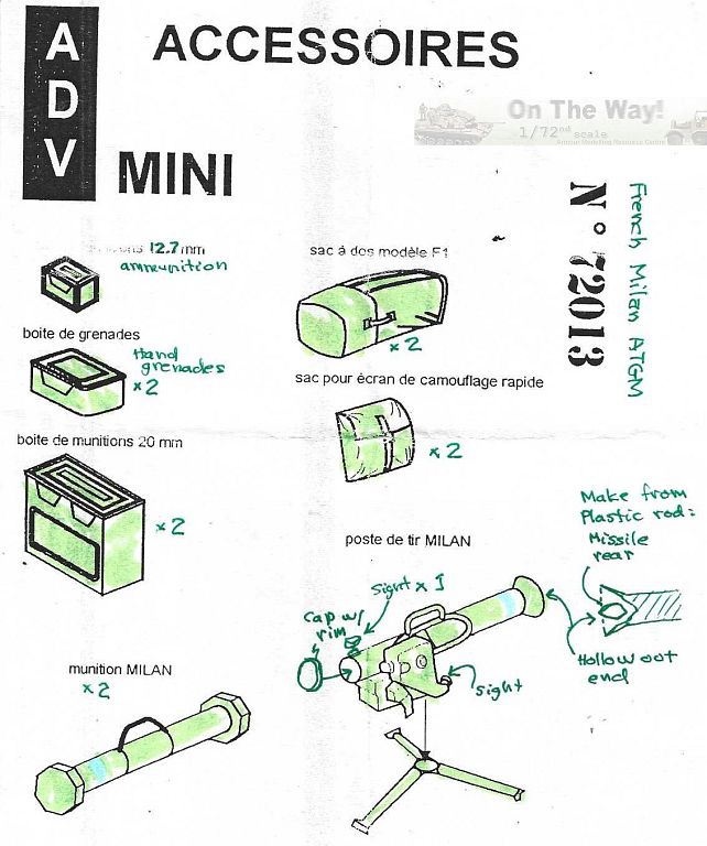 Below is the instruction sheet for ADV Mini's 1/72-scale Milan ATGM launcher with some of my notations on detailing, which includes several extra rockets