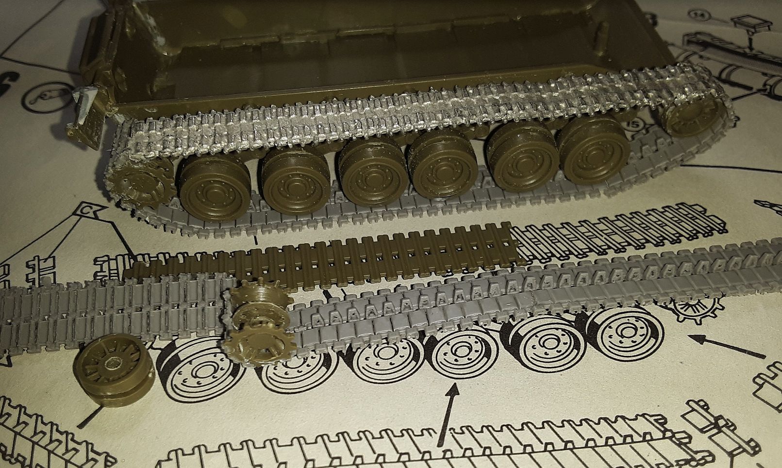 I recommend carefully lining up all the mounted road wheels with a straight edge. Leave the sprocket and idler wheels loose, unglued, so they can be moved