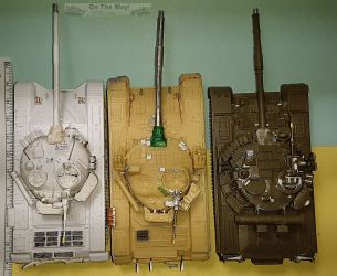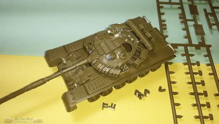 (Photo above) A comparison of the Revell T-80BV (far right, dark green) with several T-72 models: Modelkrak PT-91 Twardy in amber resin (center), and the