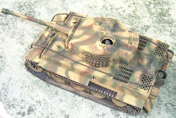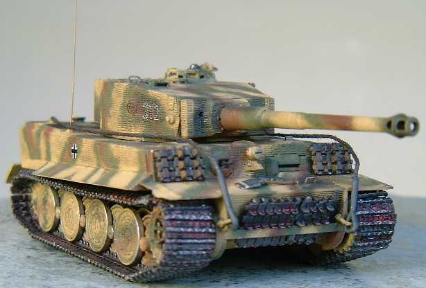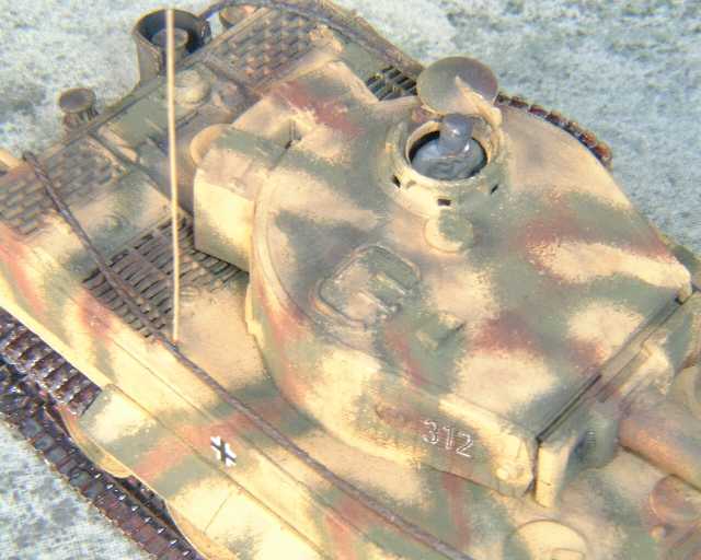 I used the kit decals that were only slightly off register and these were applied onto wet Future floor wax and allowed to dry for 24 hours before decal setting solution was applied to them. The jerry cans are Leva resin, the tank commander is a soft vinyl figure and the antenna was made with soft steel wire. Spare track was taken from my earlier Ausf. H kit and from a second Ausf. E kit I bought for spares. These were attached around the turret sides and on the hull front as applique armour. I repositioned the jack into a vertical position between the mufflers and added a shovel to hull glacis from the spares box. For the tow cables I cut the ends off of the kit supplied ones, drilled out their ends and crazy glued thick thread that had been dipped in Humbrol Gunmetal paint into the holes. This was positioned in a 'ready to tow' configuration being already attached to the front tow shackles.