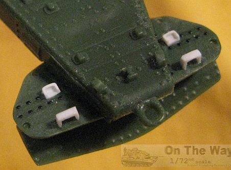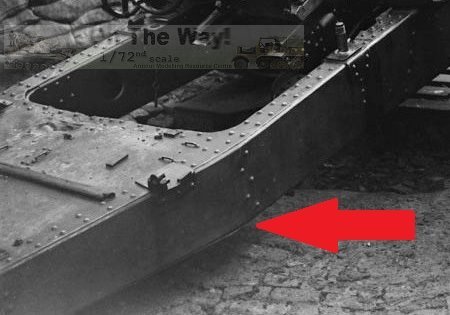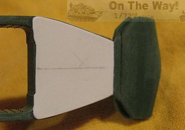 this area should be covered, based on closeups of trails found at [5]. A scratch built piece was cut from plastic sheet. Topside rivets and cross braces were mirrored