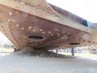 of the rear portion of this gun's trail underside. As I had surmised above, this area is covered. A surprising discovery though was the presence of six holes drilled