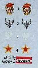 The box has beautiful, color, four-view drawings on the back. There are markings included for four tanks: Polish, Soviet, Egyptian, and Chinese. The instructions (which are very well done) state that the IS-3 was used primarily by the USSR, with two going to Poland, one to Czechoslovakia, a "large number" to North Korea (in the 60's) and 100 to Egypt. It makes no mention of how many went to China.