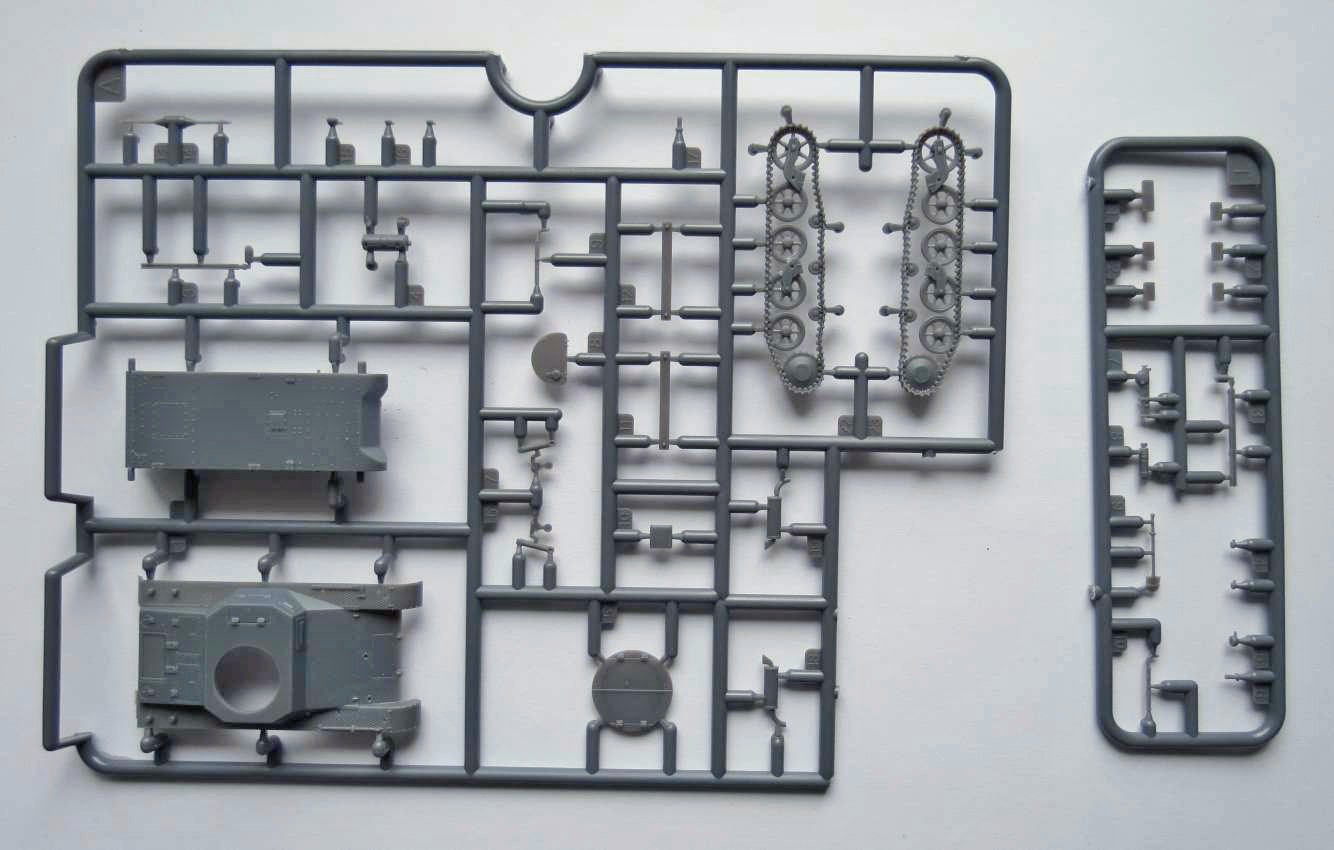 The main sprue contains most of the pieces necessary to build the vehicle, and it is the same sprue to be found in the Panzer IA kit; the only difference is the piece you can see in the lower right of the sprue, which represents the two semicircular hatches which close the turret ring. The second sprue contains extra visors (in case you decide to substitute the in-built ones, which I think you should do) and other small pieces. Since the main sprue is the same as the Panzer IA, there are some pieces which can go directly to the spare box.