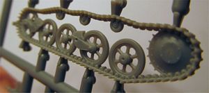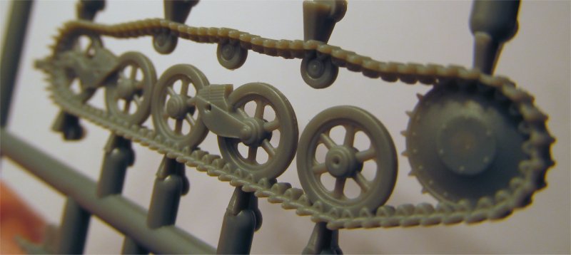 Each side of the suspension, wheels and track is moulded as a single part. Despite this, the detail is sharp. The double rows of track guide teeth are moulded as a single wide tooth, which I think is acceptable given the tiny size. Naturally, due to limitations of slide mould technology, you can not expect much detail on the outer track, which also needs careful cleaning to avoid damage to the track detail.