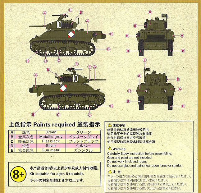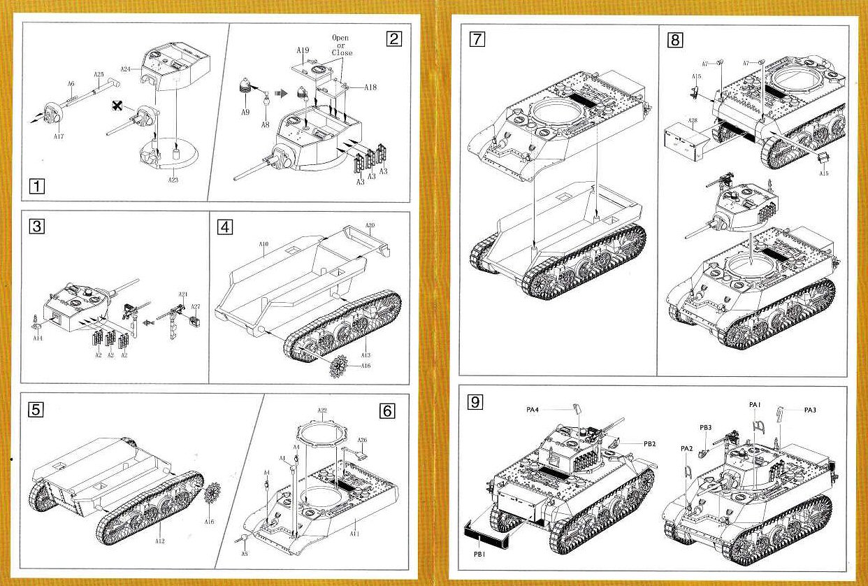 I am excited as well. . The detail is beautiful, right down to the "screws" that hold the engine deck in place, and the tracks (Vs. the ones that come with the PSC M5A1) But every kit has a few "shortcomings" so I will post the good and the bad, and let you make up your own mind. First off is the box, the art is very nice, and well meant to entice you to buy (worked on me). Now I would show you the back, but it is the same as the last page of the instructions so I'll pass on that. Here are the instructions. They are very clear, no missed steps, and easy to follow. |
