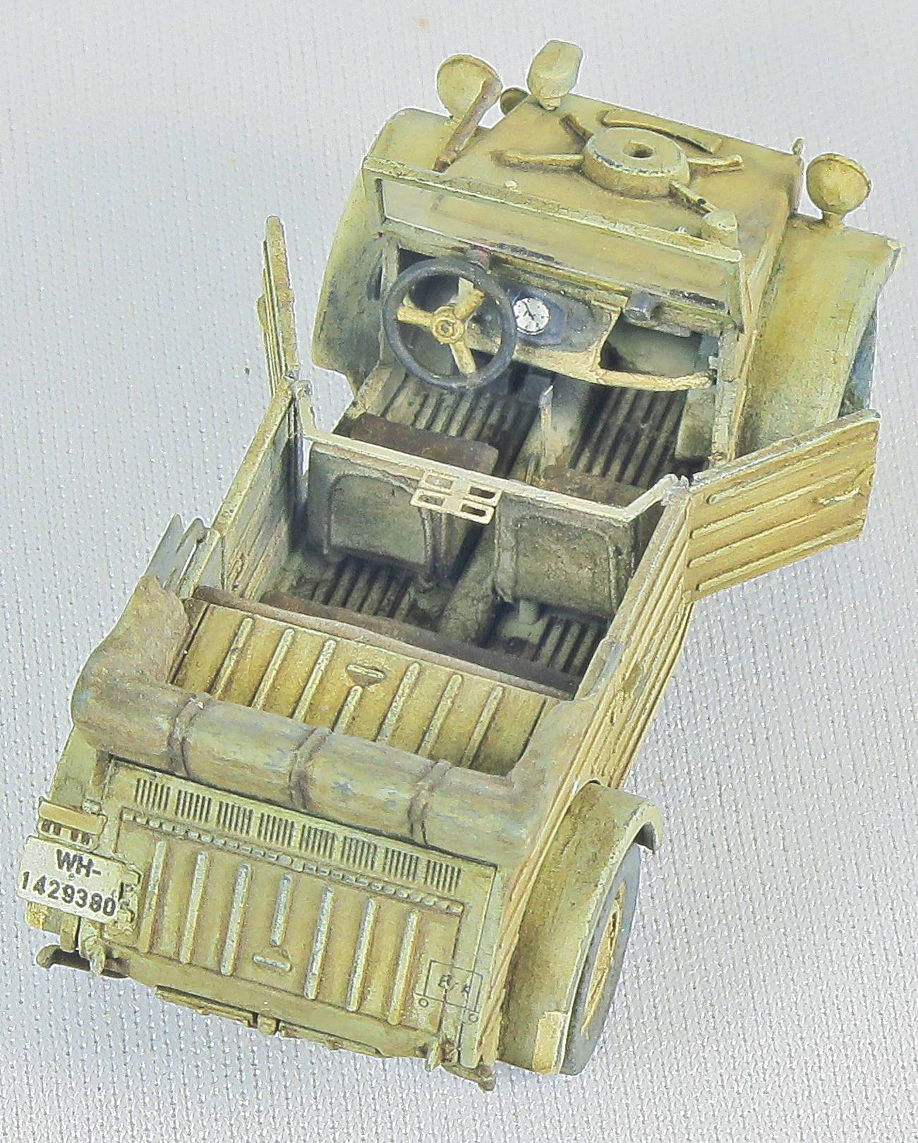 I did not use part A-12 (the air filter) or the spare wheel. I was a bit disappointed that the tarpaulin only comes in the folded position and that the PE parts for the frame were not handed. As these parts have only detail on one side, and are identical pieces for both sides, you can only see the detail on one of them after gluing them in place. This was also the only area where some extra care was needed to blend in the tarp with its supports. At the very end, I "misplaced" the steering wheel, so I replaced it with an item from Wespe.