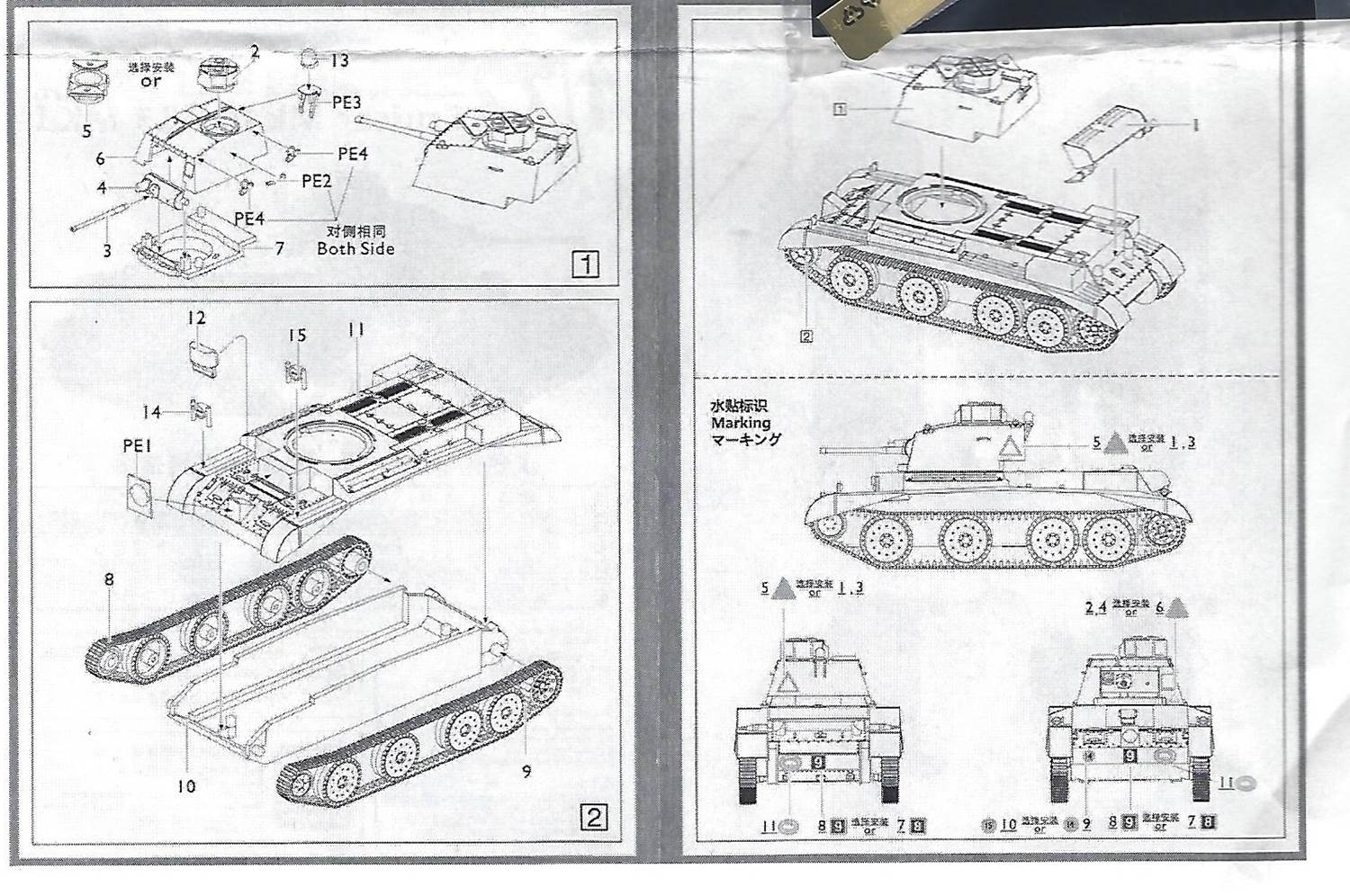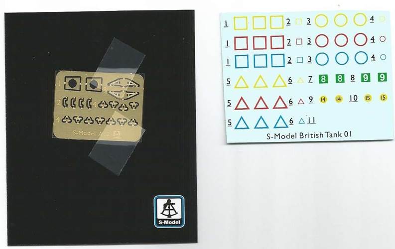 Above are the kit parts all on one sprue per vehicle, so there are two sprues in each box. At upper left is the upper hull and superstructure with nice sharp, fine detail. Up at the front is the box-like driver area with roof hatch. In the center we see the bottom of the lower hull; the large channels running down each side are the spaces for the Christie suspension springs. At upper left is the one-piece suspension and wheel parts 8 and 9. The suspension is well done but suffers the problem with tracks and wheels molded this way: the paired wheels are molded as one thick wheel. A fix for this is to purchase an aftermarket replacement such as from Dan Taylor Modelworks, or cut in grooves around the center of each wheel set. Cutting in the gap between each pair of wheels would involve cutting the wheels from the track, cutting or filing the space/gap, and then gluing it all back together. Notice also the wide spacing of the roadwheels on this tank. Below the wheels is the 2-Pounder gun (part-3) which has a slide molded open muzzle. At bottom right is the exhaust muffler (part-1) with two flared exhaust pipes. At the bottom center is the choice of two commander's cupolas: the open cupola (part-2) and a closed cupola (part-5). On part-2, I first thought the holes on the underside of the cupola hatches were ejector pin marks but later noted they match the raised domes on the top of the hatch lid. These protrusions do not appear to be periscopes or vent domes so I surmise they may be ports for signal flags? Missing from the hull and turret parts are the seams for the armor plates and the fine rivets, and the two smoke grenade dischargers mounted on the starboard side of the turret. Above is a scan of the etched brass fret, and the water slide decal sheet with enough for the two kits in the box and many leftover markings for other British tank kits. My A13 tank kit was shared (since there are two complete models in the box) with a friend, so the brass fret and decal sheet came to me cut up, so I borrowed this scan above from Henk of Holland website. The etched brass fret here is for two models. Alas the S-Model brass fret did not supply the two side viewports for the driver's box. Aftermarket brass from Dan Taylor Modelworks supplies these viewports, but they can also be scratchbuilt with thin plastic card. The kit instructions are the clear exploded-view type, typical of other S-Model kits and common to most small scale models these days. The cupola parts are marked wrong: the open cupola is part 2 not part 5. I thank