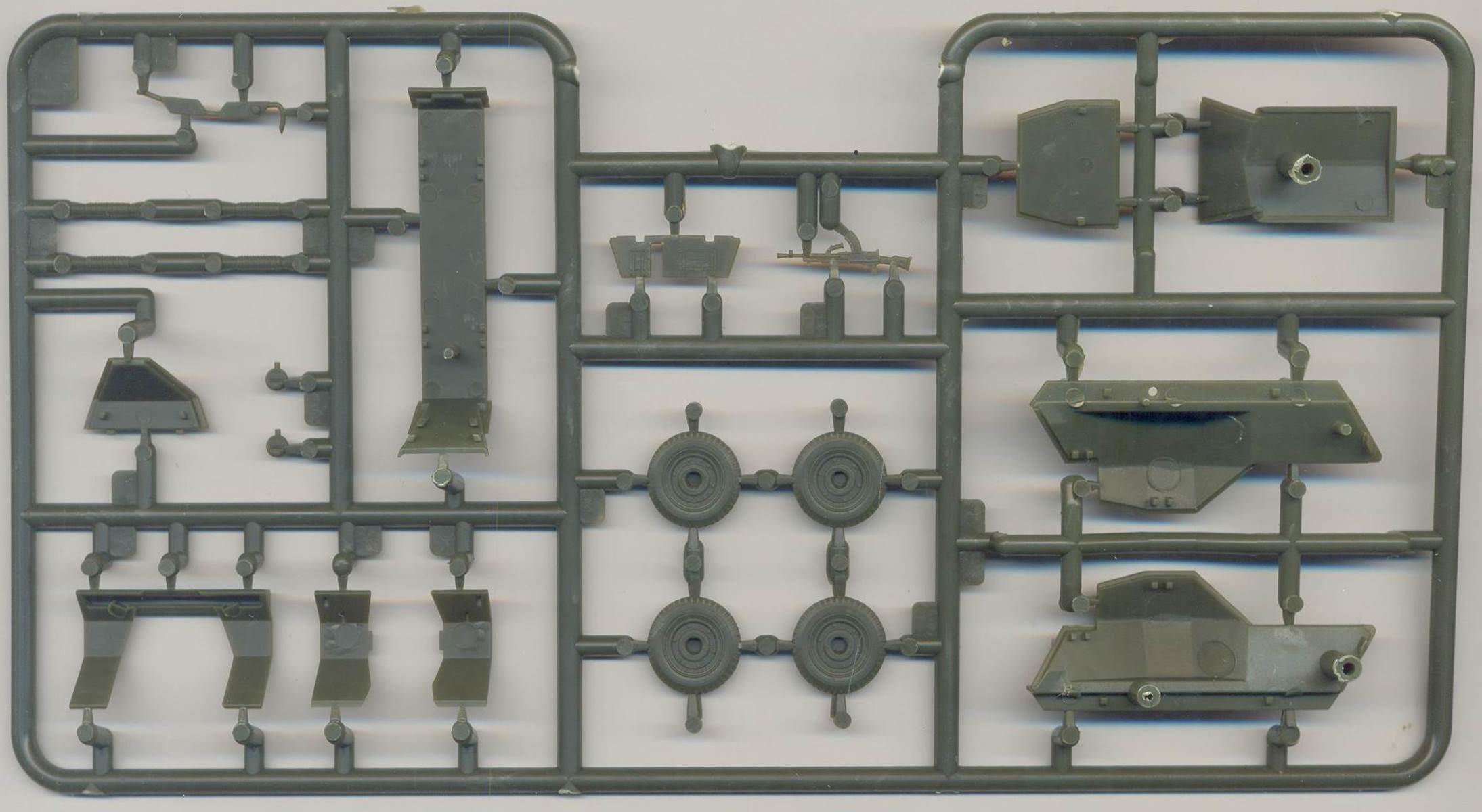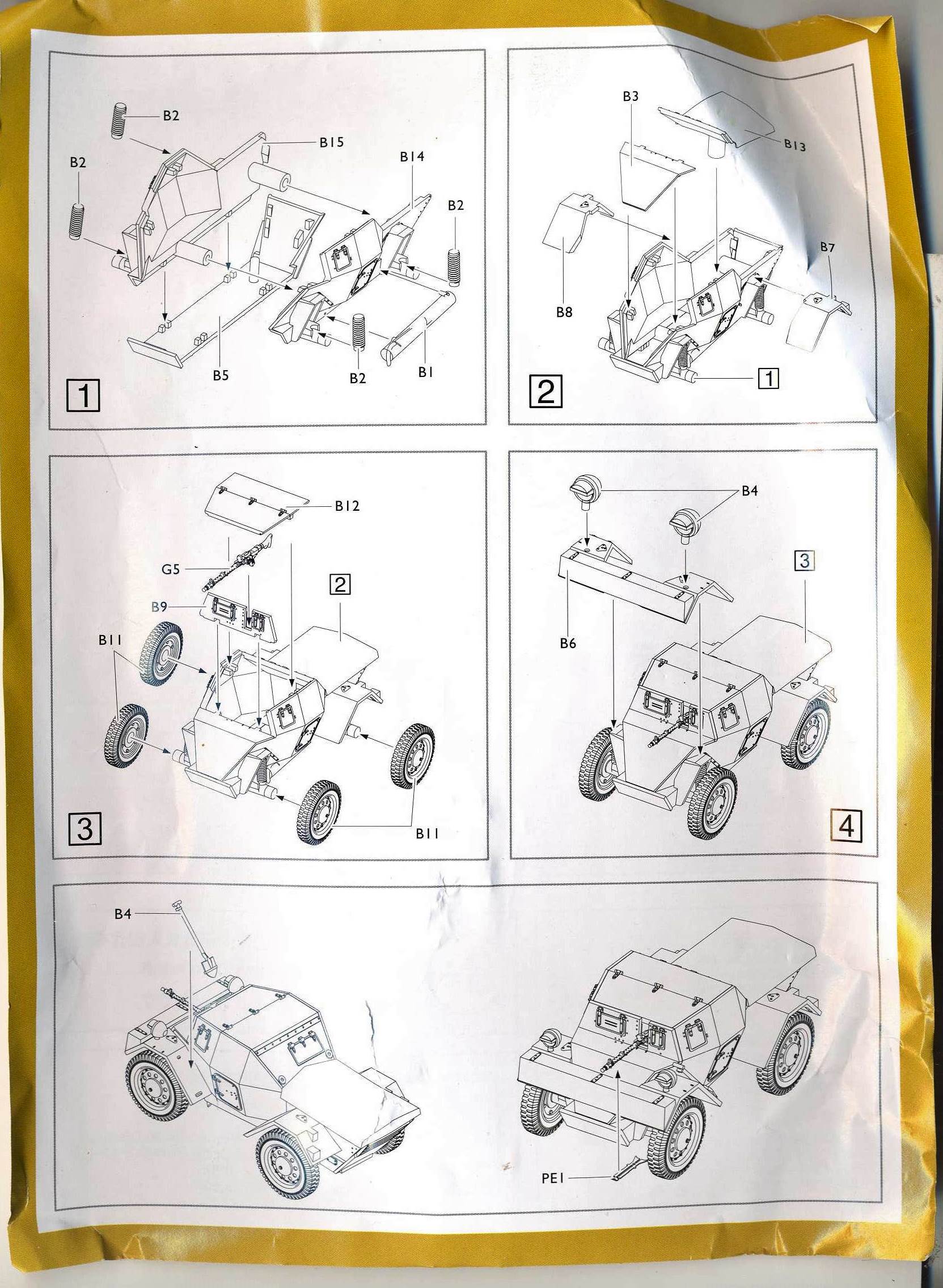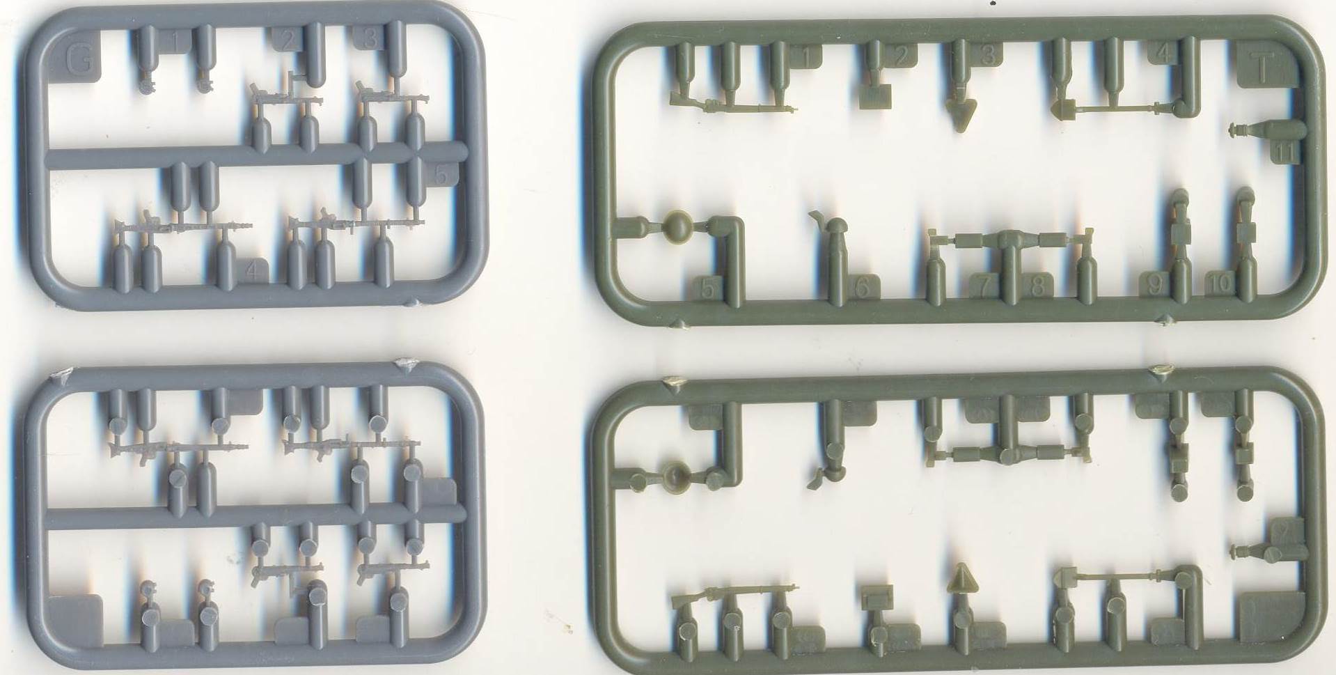 This is the second variant of the Dingo that S-Model has released to date. As the kit is very similar to the previous (British) version, of which Al Magnus has written a detailed construction review, I will only highlight the differences between the two kits. The main sprues are the same. The Bren Gun will go straight to the spares box. The small gray sprue is only present in this Beute-version, while the small green sprue can also be found in the British version. Note that you will only need the MGs from the gray sprue and the shovel from the green sprue. (You might have noticed that the shovel, part T4, is misidentified on the instruction leaflet as part B4.) This will leave you with two spare MP40s, Lee Enfields, British helmets and some non-identified parts. The small green sprue is actually from the Vickers Light Tank MkVIB kit (kit 720019), but was not included in the pre-production kit. While the British version had PE for the roof support (not needed for the Mk.I represented here), some fixtures on the fenders and a bipod for the Bren, we now get 4 folded and 4 deployed bipods for the MG34, which means 6 will go to the spares box. The manual is only half the size of that in the British kit as there is only one marking option (given on the back of the box), even though we get 4 types of crosses, so the modeler can vary a bit, if it weren't that... ...the decals seem to be out of register, and are thus pretty useless. This means that the only really useful parts of this boxing are the MG34s (and spare MP40s). If you have a spare MG34, you might as well start from the British boxing (as Al Magnus did). PS: Pictures of the vehicle in German use can be found on Beutepanzer.ru (here, here, here and here). Note that some of the vehicles shown are actually Mk.II. Also note that the name S-Model gave to this model is not quite right as it was called a Panzerspähwagen Mk I 202(e) in German use, definitely not a PzKpfw.