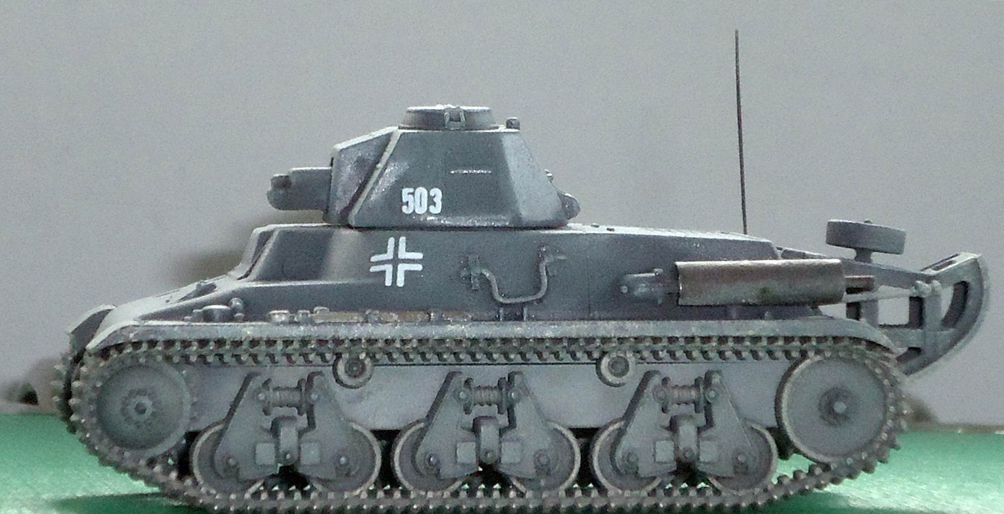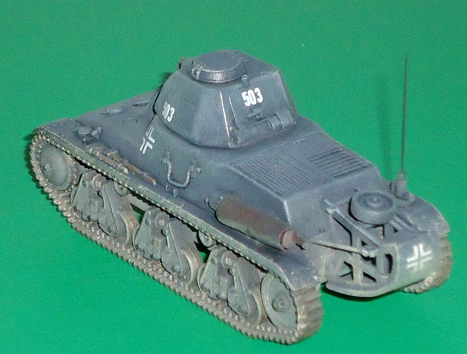 The omission of the trench crossing tail in the German version is curious, as it seems to have been fitted to a lot of the tanks used by the Germans. As kit 72009 comes with an open and a closed German cupola, you can use the spare on kit 72008 and build it as a Beutepanzer with a trench-crossing tail, as I did. Note that a number of Beutepanzers were converted to turretless ammo carriers and tractors and a few were equipped with rocket racks. Going through my references I also discovered that some H38/39 had spoked idlers and that the Germans often added extra boxes to the side of the hull or the "tail". A Notek headlight was also often seen, although this is lacking from the kit.