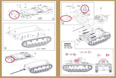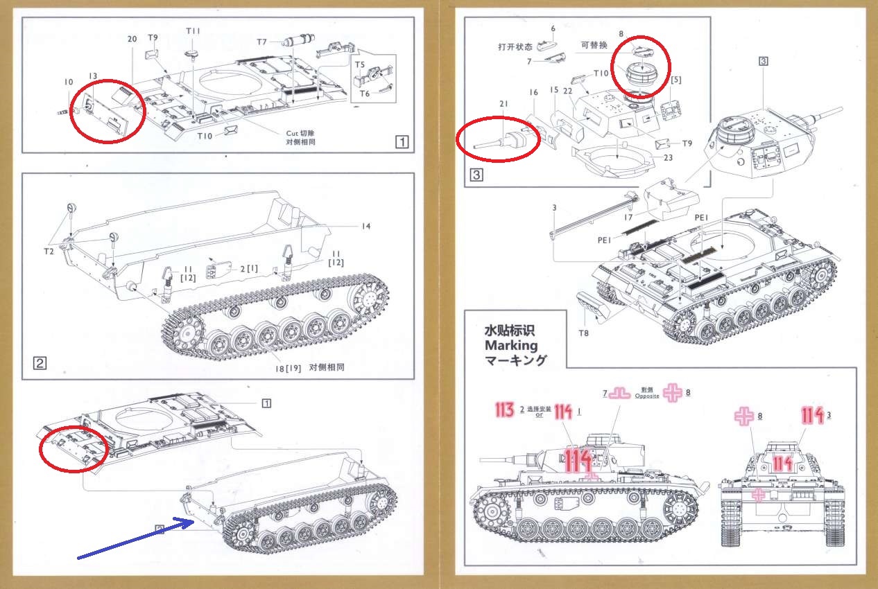 | Here are some additional thoughts about the kit. First of all, let's look at what the kit aims to represent. It seems to want to be a very late version of the Panzer III Ausf. G, and late features (cupola, 5 cm gun, additional armor on front hull) are circled in red in the diagrams below. Actually, based on the feature marked by the blue arrow, one wonders if S-Model also wanted to make a version with bolt-on armor on the lower front. However, on the actual model the bolts are represented in the upper hull but not on the lower hull. The equidistant return rollers and the old-style sprocket severely constrains what the kit could represent in terms of later variants. In contrast, the extra armor presents constraints on how early the variant could be. Moreover, the desert vents impose further limits.