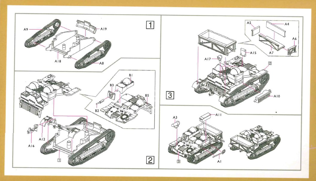 S-Model are now putting the instructions on the back of the box and the only painting guide is the front of the box, as no paint numbers are mentioned you will have to do some research! References [1] June 1940 The Impossible Revival, Pascal Danjou (2006), Editions du Barbotin [2] Renault UE Focus No 1, Pascal Danjou (2007), Editions du Barbotin Other references found by the editor that may be useful: (Chinese UE) [3] AxisHistory.com [4] wheelsage.org [5] dieselpunks.org (German Beute UE) [6] (if I remember correctly, photo is from AxisHistory.com -