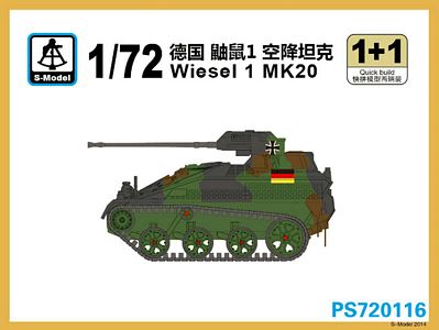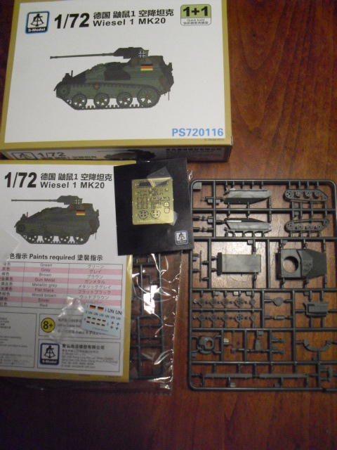The kit is packed in the usual S-model box layout. Box top shows a side-view picture of a "wiesel", and opens from the side. It holds two sprues , each contains 32 parts in semi-hard polystyrene , representing one vehicle each. 32 Parts for one quick-build model, more than compared to First to Fight , or Armourfast Kits . Decidedly more than the earlier S-model. There is more: A fret with some etched parts, among them tools for both vehicles are also included. A small decal sheet is also provided : modern German army crosses, UN letterings, and the german flag, all sized to suit the petite vehicle. Note there is another Wiesel type in use, which has one road wheel extra. This "weasel" is the smallest one issued to the federal german forces and is most widely used by German airborne formations.