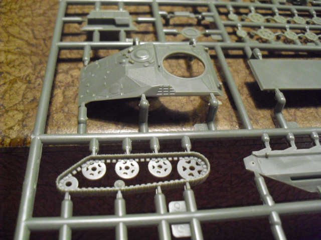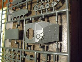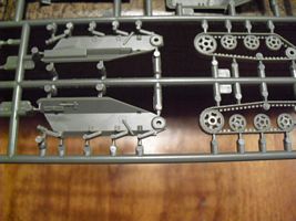 The gun, and design of mounting it , allows you to elevate it and the "turret" holding the gun can be rotated to simulate any position of use, suiting diorama or scenes in airlifting operations. A closer look at hull details and the single teeth in the well detailed track units show yet another surprise: Idler and running wheels are duplicated , you get loose doubles to add , as to have the flat moulded track teeth passing through them!