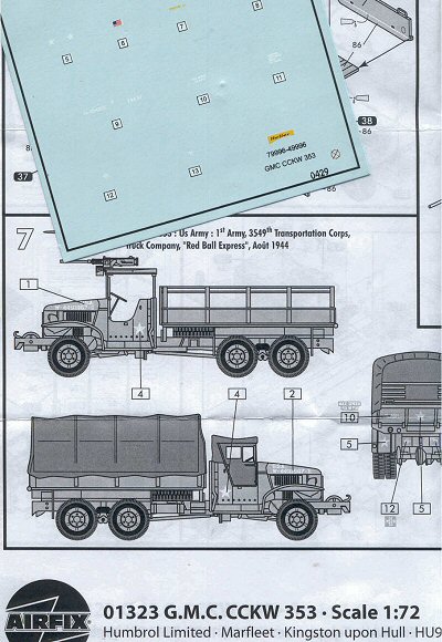 Airfix offers good kit instructions and multiple line drawings. Above are nice drawings showing the placement of the water slide decals. Airfix offers markings for only one truck but there are a lot of markings, a vehicle in the famous Red Ball Express during the summer and autumn of 1944 in France. I am unfamiliar with the decals offered in the Heller release of this model. Airfix and Academy are the only kits at this time offering the AA machine gun mount. Contrary to the Airfix box photo, no 5-gal. Fuel cans are included in the box (These are available from LEVA and in Academy’s GMC and Jeep-Kubelwagen kits though).