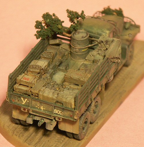 The LEVA Productions resin cargo accessory (Kit #72 E 10) is designed for the Hasegawa GMC KIT but fits well in the Cooperativa model. The larger fuel drum is from MarS Co. Extra parts from the PST GMC kits have supplied the front bumper and winch and the front fenders. The headlights were scratchbuilt from plastic sprue pieces.