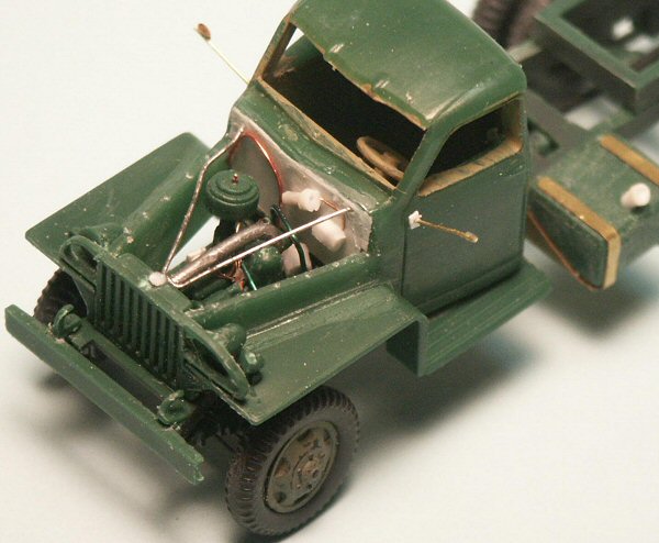 The canvas cab doors that come with the kit are molded in clear plastic so all we have to do is mask the windows and paint it the canvas color. The doors are very much too thick and stuck out from the cab side like poor fitting metal or wood doors. For more realism and scale accuracy clear plastic-wrapper material was cut to shape, glued to the cab sides and doors with super glue, the window area masked with taped and then painted.