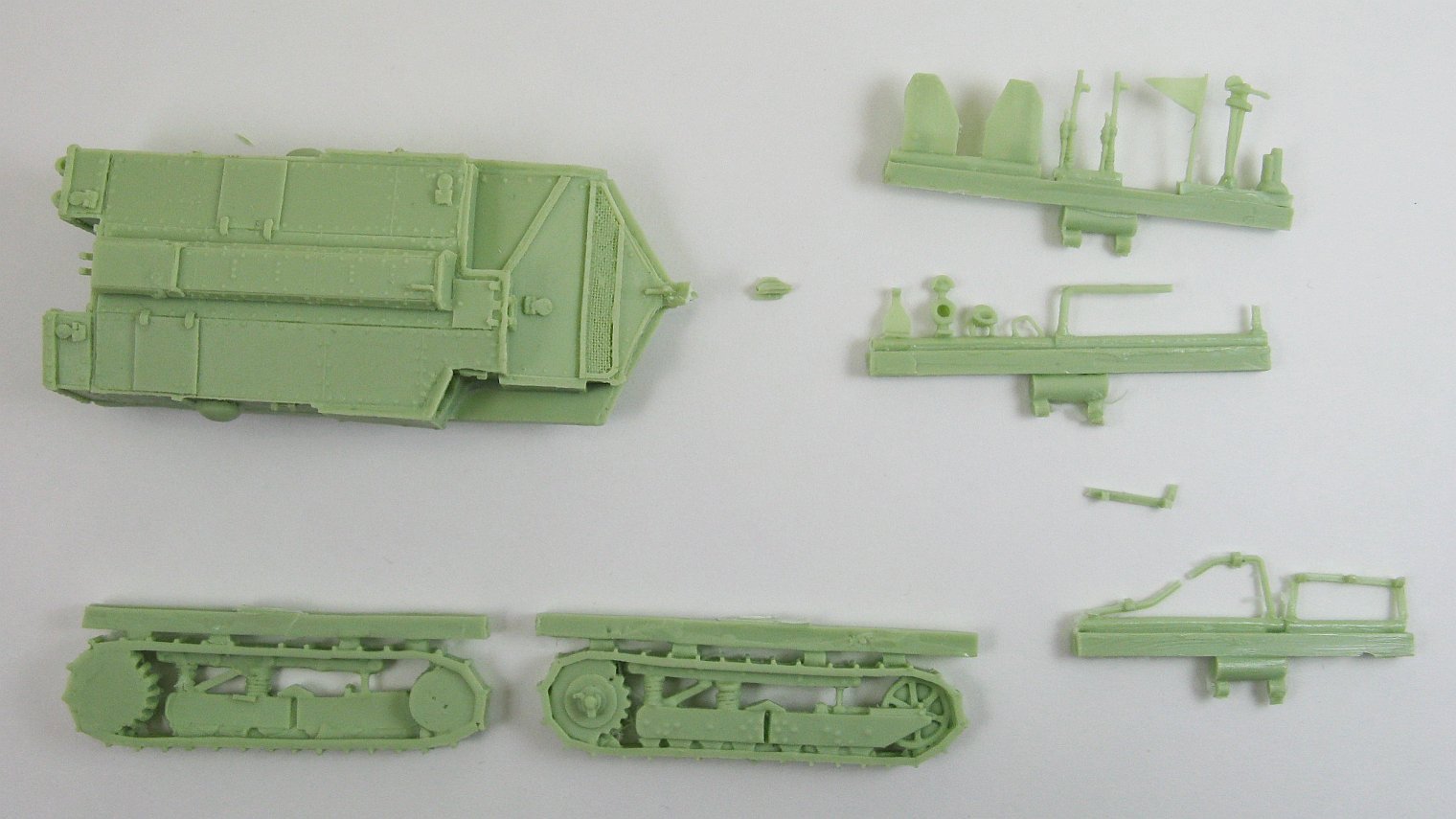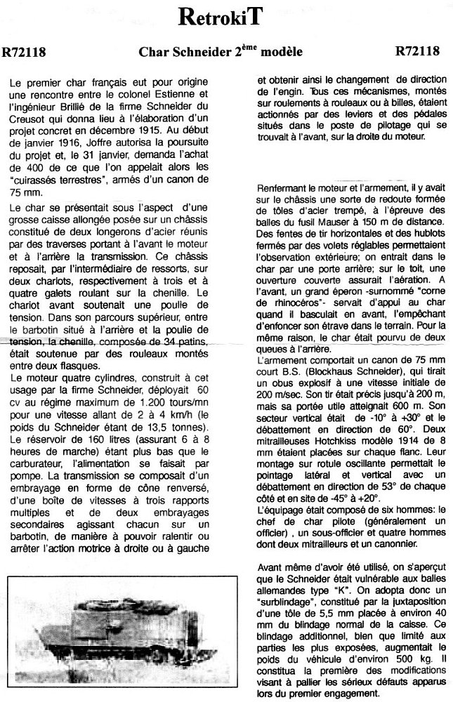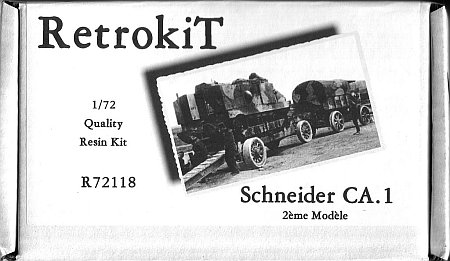 There are too few WW1 armour subjects available in injected plastic which is unfortunate. Outside of the nice injected plastic offerings from Emhar, this leaves the smaller resin manufacturers to fill the void. The Schneider CA.1 tank was not very successful. In combat it proved easy to knock out due to the exposed fuel tanks located on the side. This kit represents the CA.1 Type 2 version with extra body armour and the fuel tanks relocated to the rear of the tank framing the rear door. In all, some 400 Schneider CA.1s of all versions were manufactured by August 1918, when production ceased. At least one Schneider was delivered to Italy but it was not liked and there was no Italian production of the tank. After the war, the tanks were rebuilt as recovery vehicles and tank transporters. Six were sold to Spain in 1922, and from 1923 to 1926 were used in fighting in Morocco, the surviving four vehicles later taking part in the Spanish Civil War near Toledo on the side of the Republican army. I find it interesting that the box has the RetrokiT logo on it. At one time Retrokit was run by two partners, Dominic Jadoul and Marc Urwicz. Marc Urwicz is now based in France and continues to offer some of the Retrokit items under the new name Solfig. Dominic Jadoul is based in the UK and offers his part of the Retrokit line as RetrokiT. Receiving a box labelled RetrokiT from Solfig can only lead to confusion with the modeling public. So what kit are you actually getting when you see RetrokiT on the box? Is it a RetrokiT model or is it a Solfig model? Is it from old RetrokiT stock or a new Solfig item? You'd think that for brand recognition something should have been done to distinguish the Solfig line from the old Retrokit line - like maybe print some new Solfig labels to place over top of the RetrokiT printing on the box.