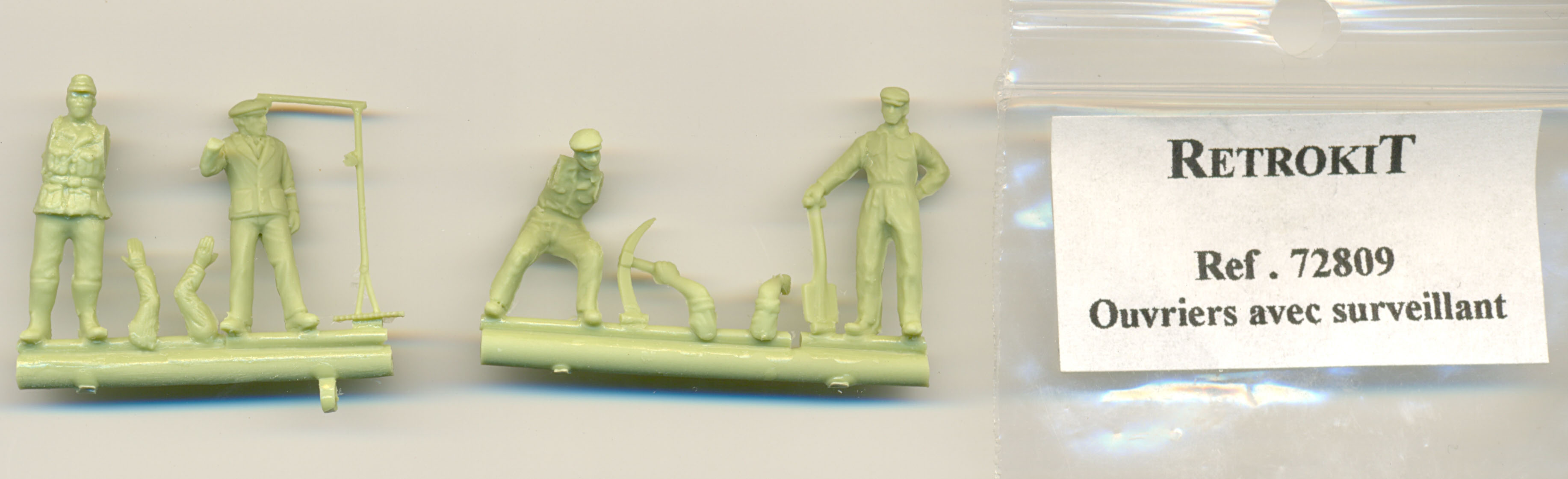 I'm still not sure whether I have clearly grasped the way in which the old Retrokit range was split between RetrokiT and Solfig, or between Retrokit(UK) and Retrokit(FR). My set carries the label "RetrokiT", but according to our sources it is now in the Solfig catalogue. I'll leave it up to the reader to identify the product when he comes across this set. The set contains four resin figures, some with separate arms or hands. One figure is (para-)military and can represent any German soldier, but in this set he probably belongs to Organisation Todt. The three others are civilians (of which two in coveralls), and can be anything from Todt workers to ordinary civilians. The one with the shovel would make a convincing farmer, and the one with the rake could pass for a civilian waving at troops if you give him another hand. In all, a very versatile set. Unfortunately, the casting quality is good, but not sublime. Detail is rather soft on the soldier (but better on the others), ragged blemishes can be found, and the farmer's torso is almost two-dimensional. The soldier is also rather tall, measuring around 27mm (=1m94) from heel to cap. |