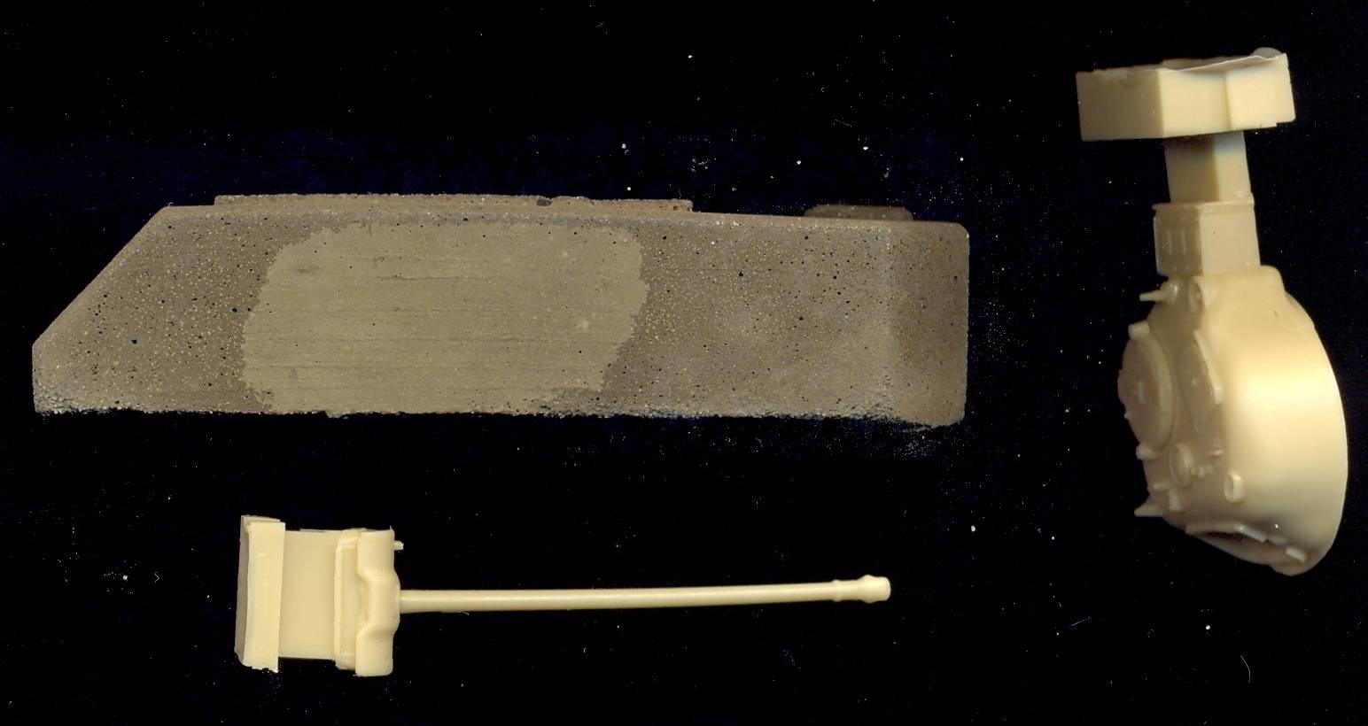 | This set represents a very original topic: the post-war use by the Dutch of their surplus Shermans, by digging them in and encasing them in concrete as strongpoints on the Ijsel-line. Various versions existed, e.g. with Ram turrets, Sherman turrets with an MG instead of the main gun and Firefly turrets. The set contains three parts. A hefty concrete part and two resin parts. This is one of the few instances where real concrete has been used for model building purposes and I am not convinced it was a wise decision. First of all, the part is very roughly cast, and while this might be convincing for the actual concrete casing, it completely ruins the detail of the splash guard and rear hatch, being riddled with air bubbles. Worse, having rubbed my fingers over that said hatch, I know find myself with concrete dust on my workbench, and a hatch that only vaguely resembles that in the pictures below (taken before the rubbing). Then again, I would have replaced it with styrene anyway. Moreover, most of these bunkers were dug in, so you will either have to create a diorama with a sufficient height to dig it in, or (somehow) remove the lower part of the concrete block. Reiterating, I am not convinced. The two resin parts, on the other hand, are far better, with only a minor seam to clean up, the occasional pinhole to fill in and a barrel to be straightened. For those who are wondering: yes, that turret bears a very uncanny resemblance to an assembled Dragon Firefly turret, which started me thinking. When you compare the price of a Dragon Sherman Firefly (before the recent price hike) with the price of this set, and consider that the top of the concrete part might easily be scratchbuilt, one could question the economic wisdom of this set.