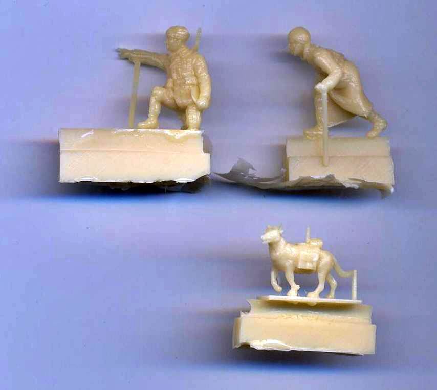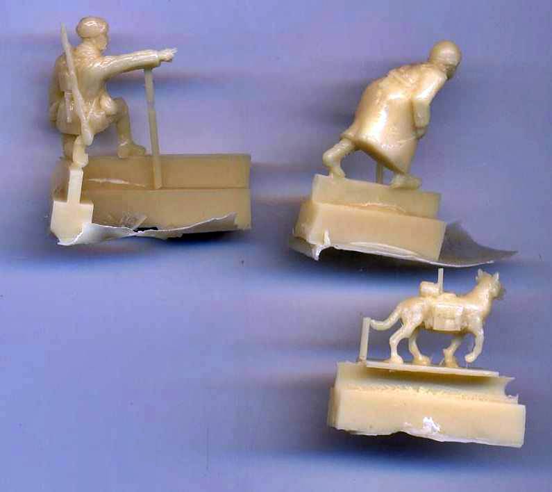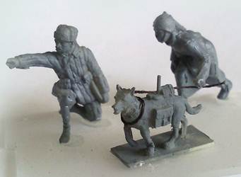 an explosive strapped to their backs. This set represents such a dog (with explosives), apparently a German Shepherd (no pun intended), with two Soviet soldiers. Sculpting