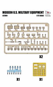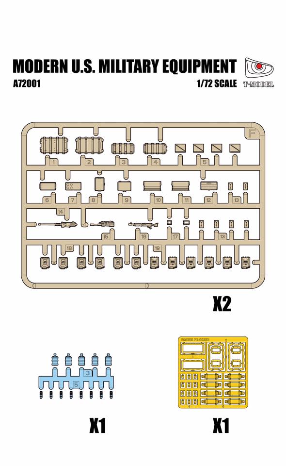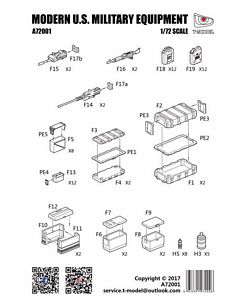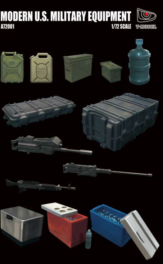| T-Model has put into production a set of modern U.S. military equipment, which was long overdue because there is none in plastic on the market; considering the quantity of equipment that every modern U.S. vehicle carries in battle, without sets like this it would be much harder to increase realism of a finished model.