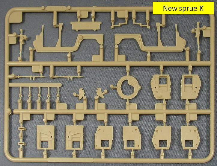 | Sprue K is a completely new addition. It not only carries the Frag 5 doors, but also a number of (not for use) extra's such as two M240 MG plus swivel mounts and two RPG-7. | ||