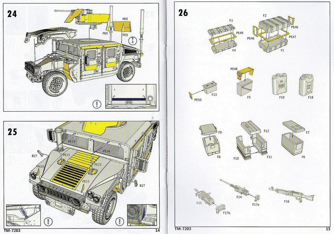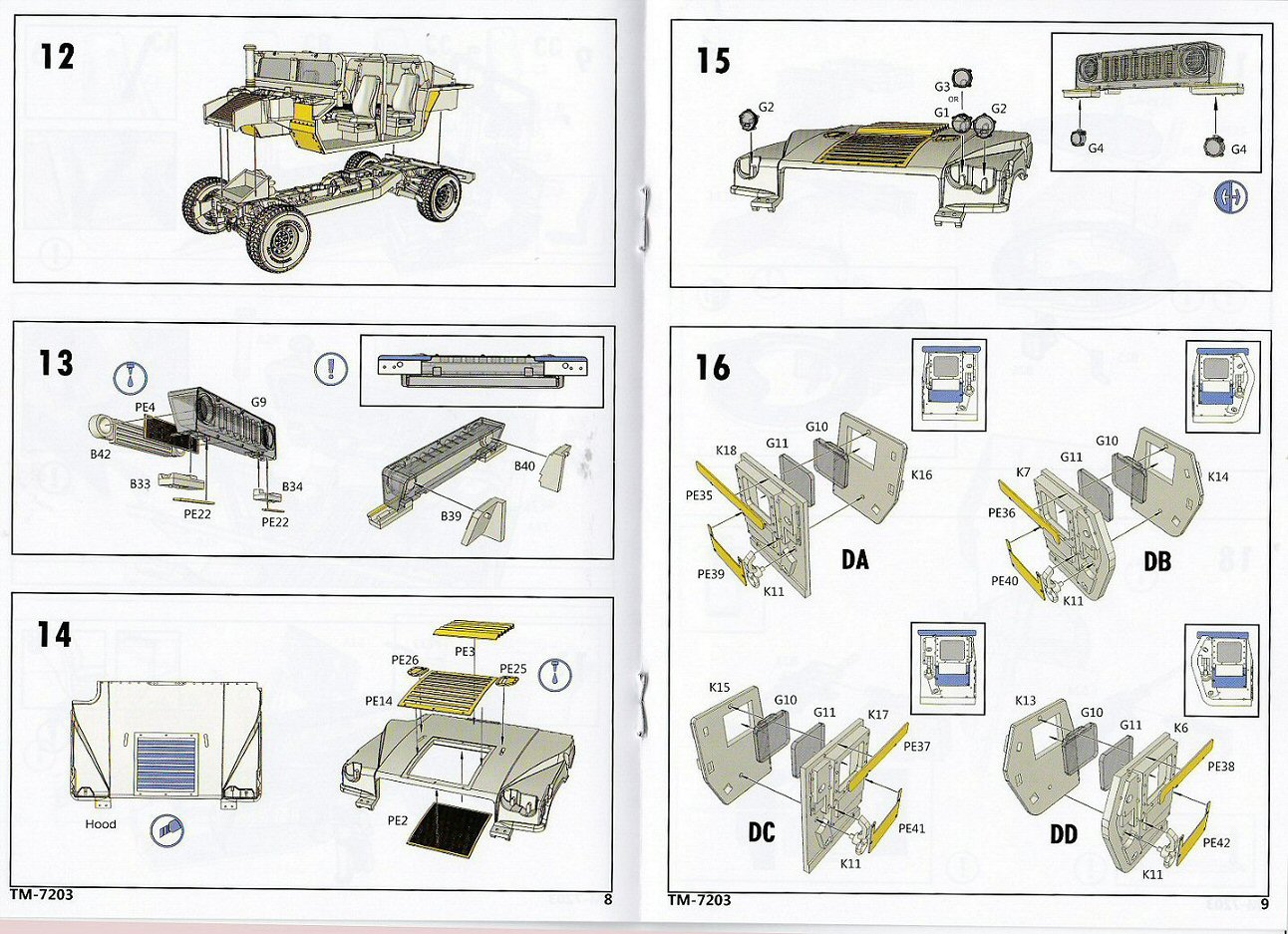 The PE set is definitely bigger than in the "old" kit and gives you all the parts needed for the basic M-1114, the Frag 5 with GPK and the weapons sprue. The only PE "choice" part is the PE grill for the hood (bonnet), which you can use to replace the plastic grill moulded in place. The other PE parts on the sheet are not replacements for plastic ones in the kit, so you have no other option than to use them. That aspect makes this kit not suitable for beginners, because it involves a lot of fiddly work bending fragile PE parts.