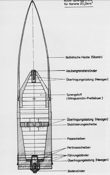 This set is made from turned aluminum. Inside the package are 3 copies of some very large shells for use with the Dora railroad gun. At the writing of this preview the Hobby Boss Dora is the only kit available in 1/72 scale. As to the accuracy of the shells, I have no clear data on the real items for comparison. I can assume that the shells will be in the order of 80cm in diameter, but for the length I have no firm data. Reference [1] has the dimensions listed as thus => Ammunition length without cap: 2.4m, Ammunition length of cap: 1.53m. As the diagram below shows, the cap (Haube) overlaps a portion of the other part of the round. What that implies for the total length is unknown. Reference [2] has the dimensions listed as thus => Length of shell: 3.6m