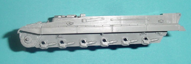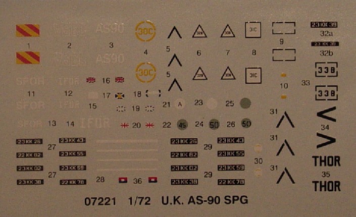 Following on from the other unusual modern releases from Trumpeter (unusual only in the choice of subjects) comes their latest release, The British AS 90, with this addition we now have 2 NATO plastic SPG's, the Revell Pz 2000 being the other. The AS 90 comes moulded unlike Trumpeters other Modern releases, in a light grey plastic, this is presumably to give a neutral base should you want to model an Op Telic vehicle in Sand colour. The Hull comes in two pieces, an upper and a lower. The lower hull is nicely moulded with the suspension trailing arms being separate items and although keyed for positive location, they can be easily adjusted to show movement in the suspension, if desired.The upper hull detail is nicely done and correct, although some of the details are slightly simplified, there is nothing that needs correcting or replacing and only needs a little refining in some areas, like replacing the moulded handles. The only let down after their other modern kits, are the moulded on tools on the hull side, this makes some of the tools and details a little flat, the tow cable eyes are also moulded in position, with a length of string being provided to represent the cable itself. The drivers hatch is open, but no inside detail is supplied (one for the more adventurous modeller!) The rear door is moulded as part of the upper hull and is unfortunately shut, which is a shame, as there is a lovely open space behind it, just crying out for detail.The lights and travel lock are all separate items to be fixed on, unfortunately the headlight guards are not provided and would need to be fabricated from plastic rod or wire, whichever you prefer. One thing that did strike me, was the size of the hull when compared to the M109, it looks massive, although compared to the Pz2000 it is smaller. The turret is also very nicely done, with the correct details, but also here, some of the tools are moulded in place and suffer from the same effects as the hull tools of being a bit flat, the good news is though is that the 3 spades around the turret are separate items and look all the better for it. The 5 bins around the turret are also separate with the lids being separate as well. The commanders and crewman's cupolas are both with open hatches and can be rotated, a nice GPMG is provided, but it is missing the bi-pod that it should have.All the ammunition boxes are provided for the roof and whilst a bit simplified they can be used with a little work.the APU generator on the rear of the turret is a separate piece, nicely moulded with all the cooling ducts/louvre's being present and finely moulded, also on the rear of the turret are the spare track links, these are moulded in place but do not suffer from the same fate as the tools and are moulded in good relief. The turret roof stowage basket is provided as a plastic piece and would benefit from some PE Mesh. The gun barrel and recuperator housing are nicely moulded and detailed, unfortunately there are two problems with the barrel itself, the first is the gaiter at the base of the barrel is mould straight and lacks the distinctive sag of the real thing. the second is the barrel length, Trumpeter have provided what I presume is the 52 calibre barrel, I say presume as I have no measurements to hand,this is alright, unless you want to model an Op Telic vehicle, which only had the 39 calibre barrel length, this means having to cut approx 11mm from the forward part just in front of the fume extractor, not really a major job and fairly easy to do, but still a pain. The road wheels are correct as are the sprockets and Idlers, with nicely detailed return rollers. The track is of the link and length variety, with Trumpeter dropping the vinyl track used on the S-tank and the 3 Japanese tanks Decals are provided for various vehicles, with 9 sets of registration numbers being given, as well as C/S, the omnipresent chevrons and various SFOR and IFOR markings. Unfortunately as usual, Trumpeter have out done them selves and actually show 2 vehicles in the instructions, instead of the normal one, this still leave various decals where good reference is going to be needed for their placement. One day Trumpeter might show diagrams for placement of all of the decals instead of just the one or two that they do now. I only really have two moans about this kit, one is the barrel, the other is the placement of the decals. Overall i would recommend this kit for all Modern Armour fans, with the exception of the barrel and the moulded on tools, it is a nicely detailed kit. How it all fits together will be the subject of a review to follow soon ! The vehicle scales out at 1/72 according to my references References Jane's Armour and Artillery 1990-91 11th Edition by Christopher F Foss Jane's Tanks and Combat Vehicles Recognition guide Second Edition by Christopher F Foss