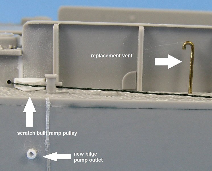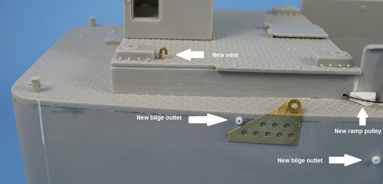point I realized the kit's ventilators didn't exactly match my reference picture. Figuring it was too difficult to make new ones I settled on drilling out the kit parts. I removed the incorrectly placed bilge outlets and added new ones placed according to my reference pictures. Also added was engine exhaust pipes and some scratch built covers.