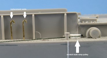 I played around trying to get the ramp to close properly against the hull with the two hinge pieces in place, but it was a no go. To get an acceptable fit I