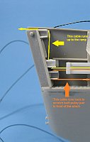 the sheave the cable splits, with one cable running through a pair of pulleys up to the port side of the ramp. The other cable runs through another pulley that