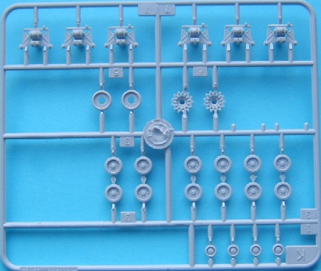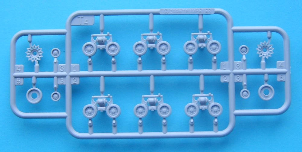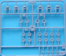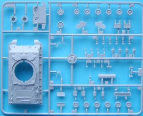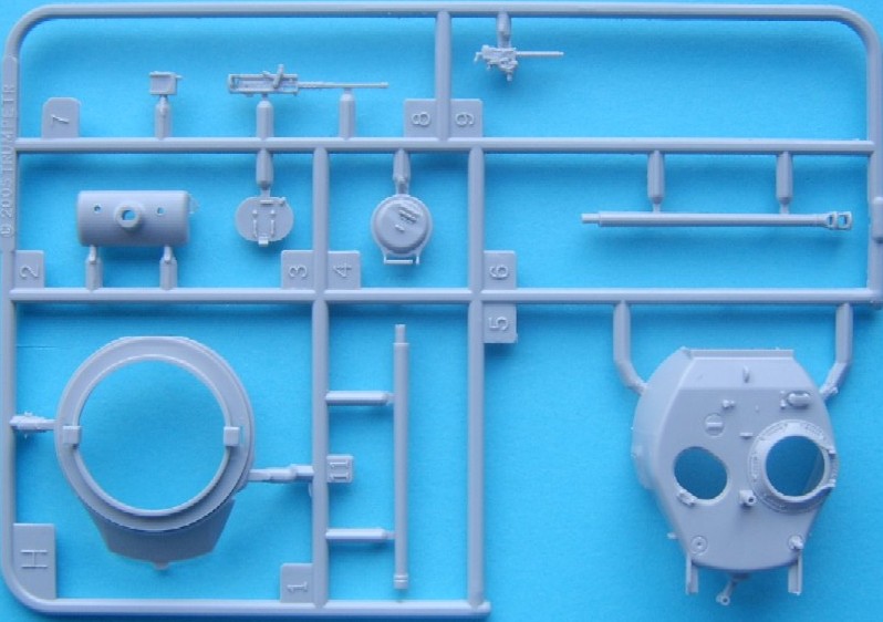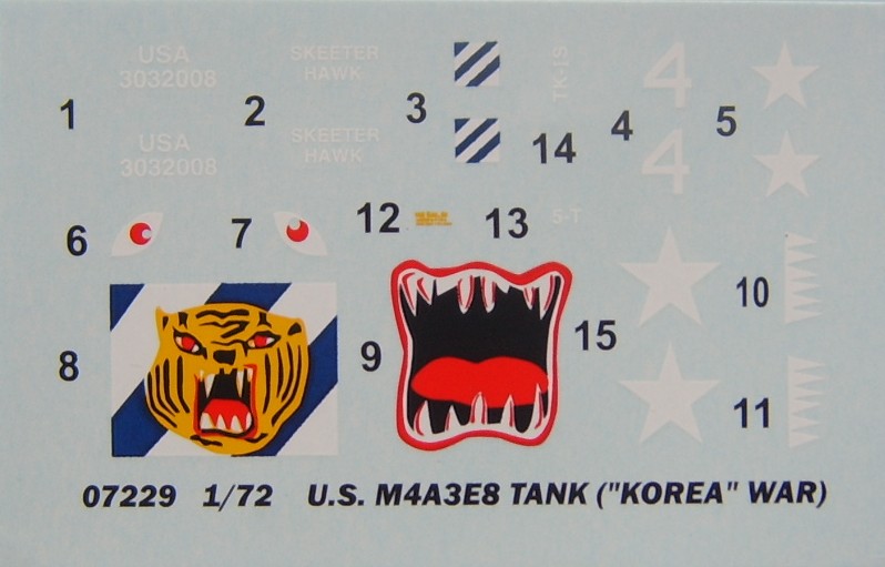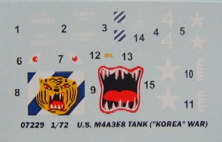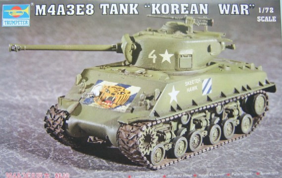 | Trumpeter have released the Korean version of the E8, the only difference between this and the earlier T 66 track version are the tracks and decals. The tracks are very late war or post war version and are also used on the Isreali M-50 should anyone want to do a bit of converting. Although the E8 was used by U.S. forces in Korea as were some M4A3 VVSS they were modified by the Tokyo Ordnance depot before being shipped, although the changes were minor and affected mainly the stowage it is something to bear in mind, as is that the E8 was also used by Canadian forces in Korea as well. As with the other Sherman's the kit is not as refined as Dragons but it is certainly usable and at the moment it is the only viable HVSS suspensioned Sherman in Plastic. The suspension is correct in size and although slightly simplified in some areas, it is perfectly usable. The lower hull is the same as used on the M4A3 75mm kit and has the same fit problems if care is not taken when affixing the two parts. The hull is the same as the A3 but has the hull extensions to cover the wider track moulded on, this means that the supports for these are solid and not bars like they should be. The rear hull around the exhausts differ in build than on the A3 kit. The kit has the correct turret for the type with the oval loader hatch and a choice of barrels with or without muzzle brake although the barrel with muzzle brake seems slightly short when compared to the Dragon barrel. Also included are the optional .50 and .30 cal weapons, although the .30 suffers from the same ammo box as the A3 kit mainly it is lying when it should be standing. The suspension. The suspension is correct in size according to the dimensions given in Dougs Article Sherman HVSS The easy suspension with the front wheels fitted, the rear wheels have to be added hence the need for two kits for a third set. The new tracks, these are thicker than the T-66 tracks and so a bit more robust although they are dangerously thin around the area where they join. As with all Trumpeter kits the decals provided are for more than one tank but as usual the instructions only show one vehicle so good references will be needed for the placement of the other decals. interestingly one set are for a Tiger painted vehicle. A nice kit that measures out to 1/72, easier to build than the Dragon kits but also missing the refinements of the Dragon kits, still nothing that can't be rectified. References M4 Sherman in Action Squadron/Signal Armour No 16 Tank Warfare in Korea 1950-53 Concord books