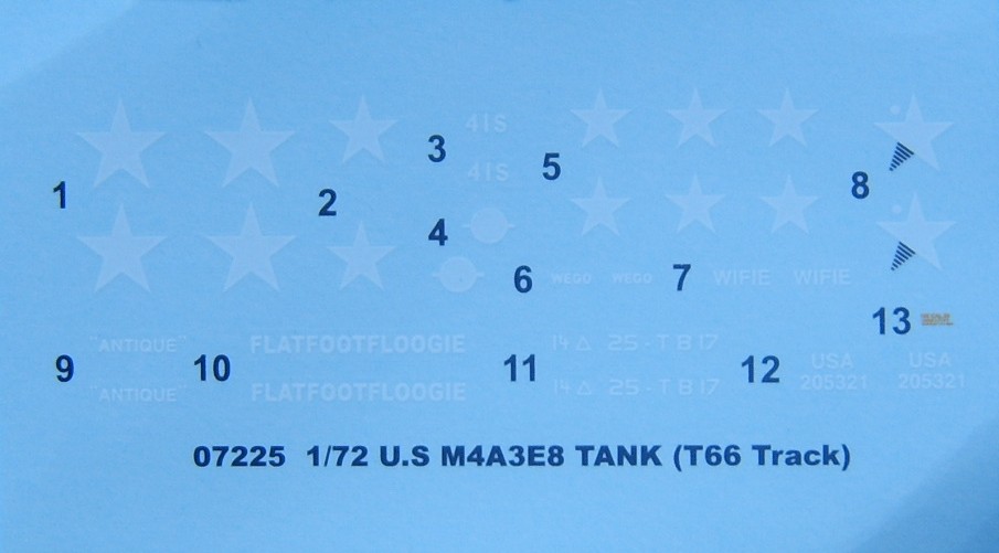The fourth Sherman and finally a HVSS version although this has the T66 track and so can only be used for the WWII period. As with other trumpeter releases it includes a set of Easy suspension although with this kit you do not get two full sets and you will need to buy two kits to get three sets of suspension, although this will mean using the easy option on two of the vehicles. As with the other Sherman's the kit is not as refined as Dragons but it is certainly usable and at the moment it is the only viable HVSS suspensioned Sherman in Plastic. The suspension is correct in size and although slightly simplified in some areas, it is perfectly usable. The lower hull is the same as used on the M4A3 75mm kit and has the same fit problems if care is not taken when affixing the two parts. The hull is the same as the A3 but has the hull extensions to cover the wider track moulded on, this means that the supports for these are solid and not bars like they should be. The rear hull around the exhausts differ in build than on the A3 kit. The kit has the correct turret for the type with the oval loader hatch and a choice of barrels with or without muzzle brake although the barrel with muzzle brake seems slightly short when compared to the Dragon barrel. Also included are the optional .50 and .30 cal weapons, although the .30 suffers from the same ammo box as the A3 kit mainly it is lying when it should be standing. The suspension. The suspension is correct in size according to the dimensions given in Dougs Article Sherman HVSS The easy suspension with the front wheels fitted, the rear wheels have to be added hence the need for two kits for a third set. The kit has the T66 tracks, these have fine detail and are very thin and fragile so that care needs to be taken when gluing and fixing them so they do not snap (like one set of mine has done) As with all Trumpeter kits only one scheme is shown in the instructions but the decal sheet includes more, including "Flatfootfloogie" there was a debate about the name a while ago, about whether it was floogie or floozie? as the only picture that I have seen of it the end of the name is covered by dust it is hard to make out what it should be, the debate ended with a 50/50 split and no definitive answer. My personal opinion is that it should be Floogie as this was a dance at the time. A nice kit that measures out to 1/72, easier to build than the Dragon kits but also missing the refinements of the Dragon kits, still nothing that can't be rectified. References M4 Sherman in Action Squadron/Signal Armour No 16 |