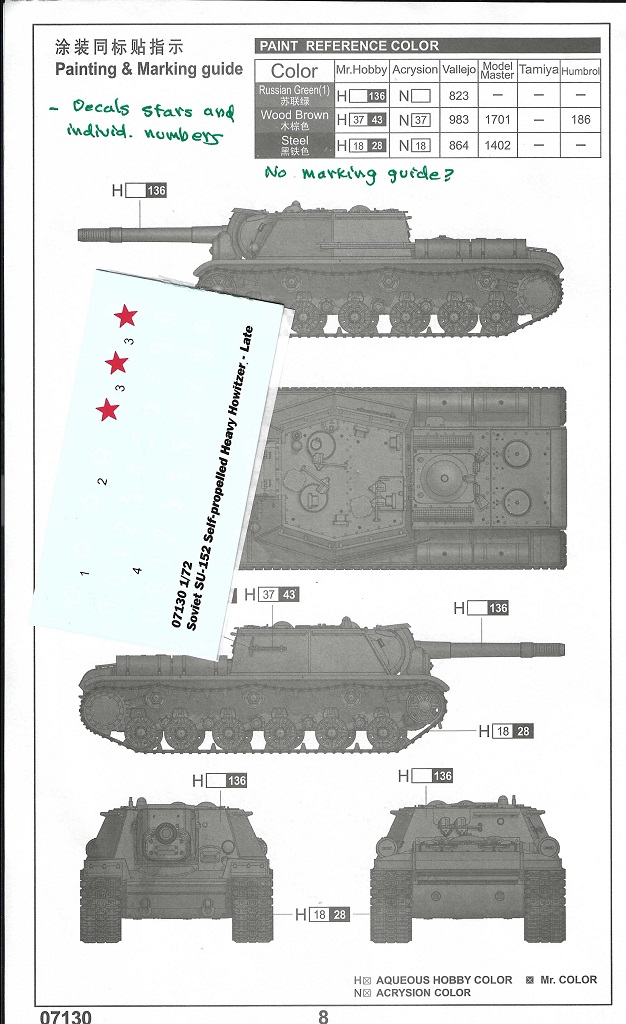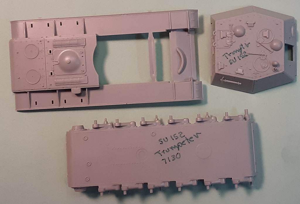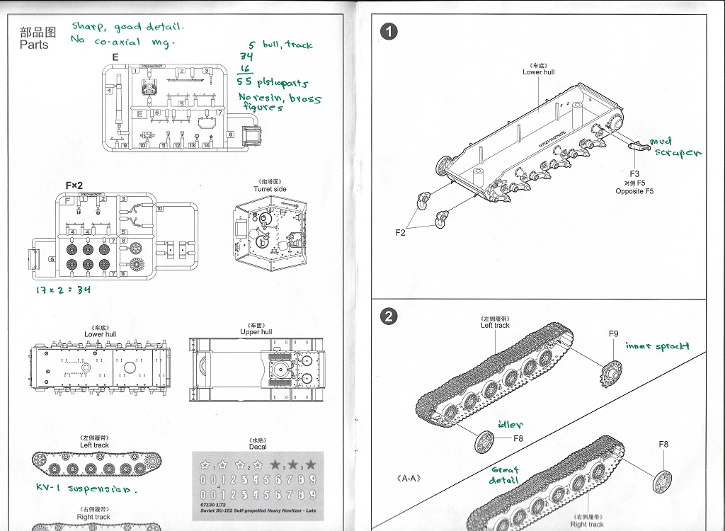 A Wee Bit Of Vehicle History The SU-152 was a Soviet self-propelled 152-mm howitzer mounted in a fully enclosed casemate (or superstructure) similar in concept to the Sturmgeschütz III and Sturmpanzer Brummbär. While providing mobile artillery support the vehicle became a useful tank destroyer based on the shear explosive force of its 152-mm projectile. The vehicle is based on the KV tank chassis and looks similar to the ISU-152 which is based on the IS-2 Stalin tank chassis and which replaced the SU-152. It retains the muzzle brake of the towed 152-mm howitzer. Like the SU-85, most Sturmgeschütz, the ISU-152 and the Ferdinand self-propelled guns, there is no coaxial or ball mounted machine gun for close-in defense. It is about time we see this somewhat recent release of this vehicle in small scale styrene plastic. Though we have had smallscale KV tanks from PST, ESCI and Trumpeter, and we have ISU-152 kits from the likes of PST, Italeri, S-Model and from Zvezda, this is the first SU-152 in styrene plastic I am aware of. Trumpeter produces both an early (kit 7129) and a late version (kit 7130). Alain Levesque of LEVA Productions produced a respectable resin kit of the SU-152 about 20 years ago. Rather than the typical photograph of an as built model we often see on Trumpeter boxes, this time Trumpeter chose to have a simple port-side profile drawing. The box art of the SU-152 early kit 7129 is the photo of a completed SU-152 model. In the above box art, we see the boxy superstructure, lower than that of the later ISU-152. On the roof we see two domed armored ventilation fans. Exterior fuel tanks sit on the rear fender. The wheels and track are those of the KV tank: six steel roadwheels on torsion bar suspension, large sprocket wheel at the rear, three all steel return rollers. On the side of the casemate is a long rack of gun cleaning rods. The vehicle is painted in a green color with no markings. The only obvious external difference between this kit and Trumpeter’s early SU-152 kit 7129 is that the early variant is missing the two ventilation domes on the roof, and the decal markings are different. I refer you to Henk of Holland’s website to view the parts of the SU-152 kit 7129 which only difffer in the superstruture part (called “turret side” on the parts diagram). Since the parts for this model kit are almost identical to the early SU-152 kit I think this review can cover both models. The Kit Parts I counted 55 pale gray color, injection