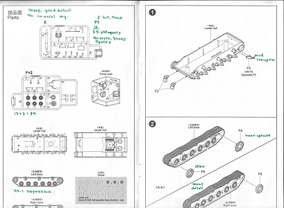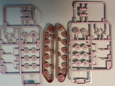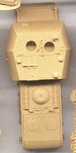 sinkholes nor flash. Above are the three hull and superstructure parts not attached to a sprue but loose in the bag and with no parts number. These casemate and lower hull parts are slide molded. The engine deck with fenders and the lower hull are that of the KV tank. On the casemate at upper right we see the three crew hatches are molded closed which is unfortunate as this boxy superstructure is crying for interior detail. The casemate roof has the two dome vents that are not present on the early SU-152 model. I see five periscopes atop the roof but the openings are all solid; it would be good to have given separate periscopes to glue on. For a good display model, I would drill out the periscope openings. I like comparing things. Above at left is the ISU-152 hull part as interpreted by PST Company. In center is the upper hull part for the Trumpeter SU-152 kit 7130. At right is the LEVA Productions SU-152 cast resin hull part. We can see that the ISU-152 and the SU-152 have similar dimensions and casemates but have different engine decks. My references indicate that the engine deck on the LEVA kit is significantly too long, but the kit does offer open hatches. The LEVA IS-152 lacks the dome vents and appears to represent the early version like the Trumpeter kit 7129. Giving a good view of the slide molded hull with suspension arms we also have a view of the two Sprue F at left and Sprue-E. The exterior fuel tanks (parts F10) are at lower left of the photo. These sprue are common to both Trumpeter kits. ![]() Sprue E holds the gun barrel (part E4) with slotted muzzle brake and the mantlet parts (E1 & E6), as well as the grab handles (parts E5, E6 and E10) for the superstructure sides. The 152-mm howitzer muzzle is molded open. ![]() Each sprue F supplies wheels and fuel tank parts for one side. In the center is the quick assembly track & wheels (parts A-A and B-B) While the track detail often suffers when the tracks are molded as one large part with the wheels, I appreciate how Trumpeter molded one side of the paired wheels separate so the complete set looks like paired wheels rather than one very thick wheel. The outside track surface detail is excellent but there is link detail on the inside surface of the track.