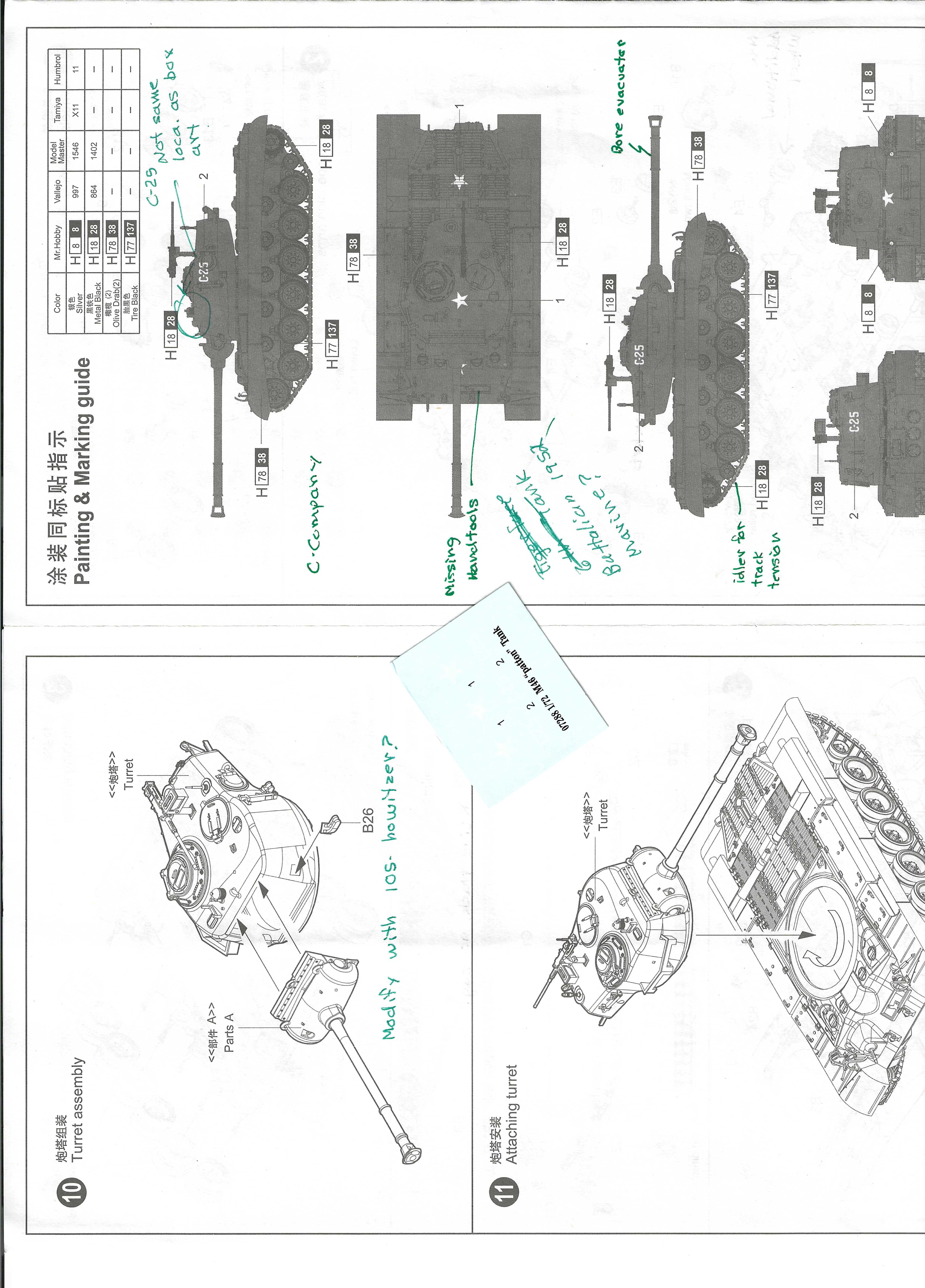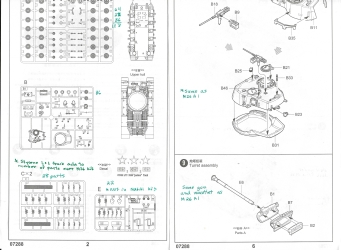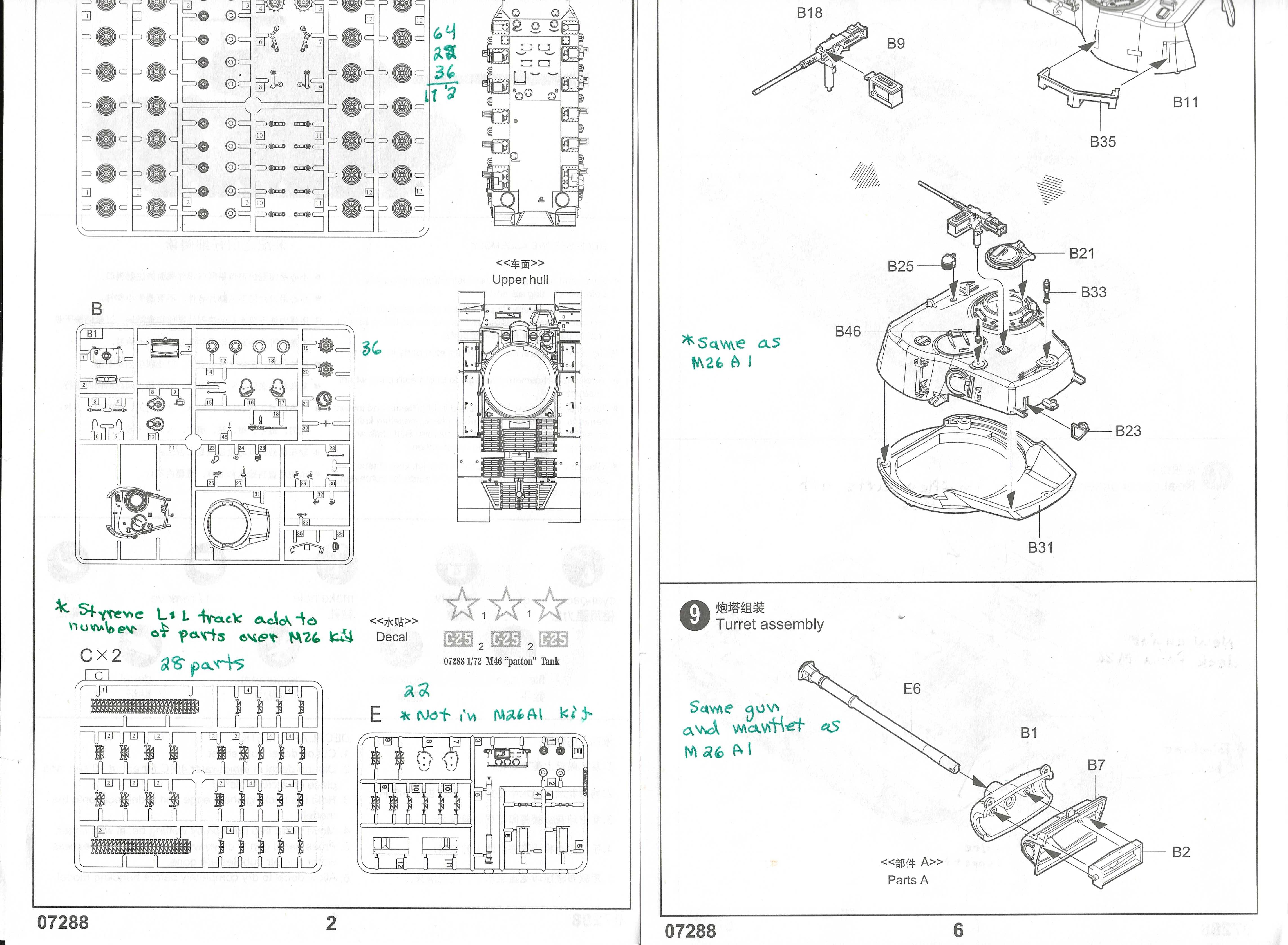 next to the vent dome. All four periscopes have wire brush guards. At left we have the final turret assembly for the M46, kit 7288 which is the same as in the M26A1 model kit. The M26 kit has a different 90-mm gun barrel but otherwise the same turret. At right is the painting and marking diagram and the water slide decals for this kit in the center of this scan. The instructions do not identify this M46 but references state it is from the 1st Marine Division in Korea during 1952. The decal paper is too pale to examine the kit markings adequately. Two more pages for the M46, kit 7288 show the parts diagram and initial assembly of the turret parts. The commander’s cupola hatch is the only hatch that can be posed open on these three model kits.