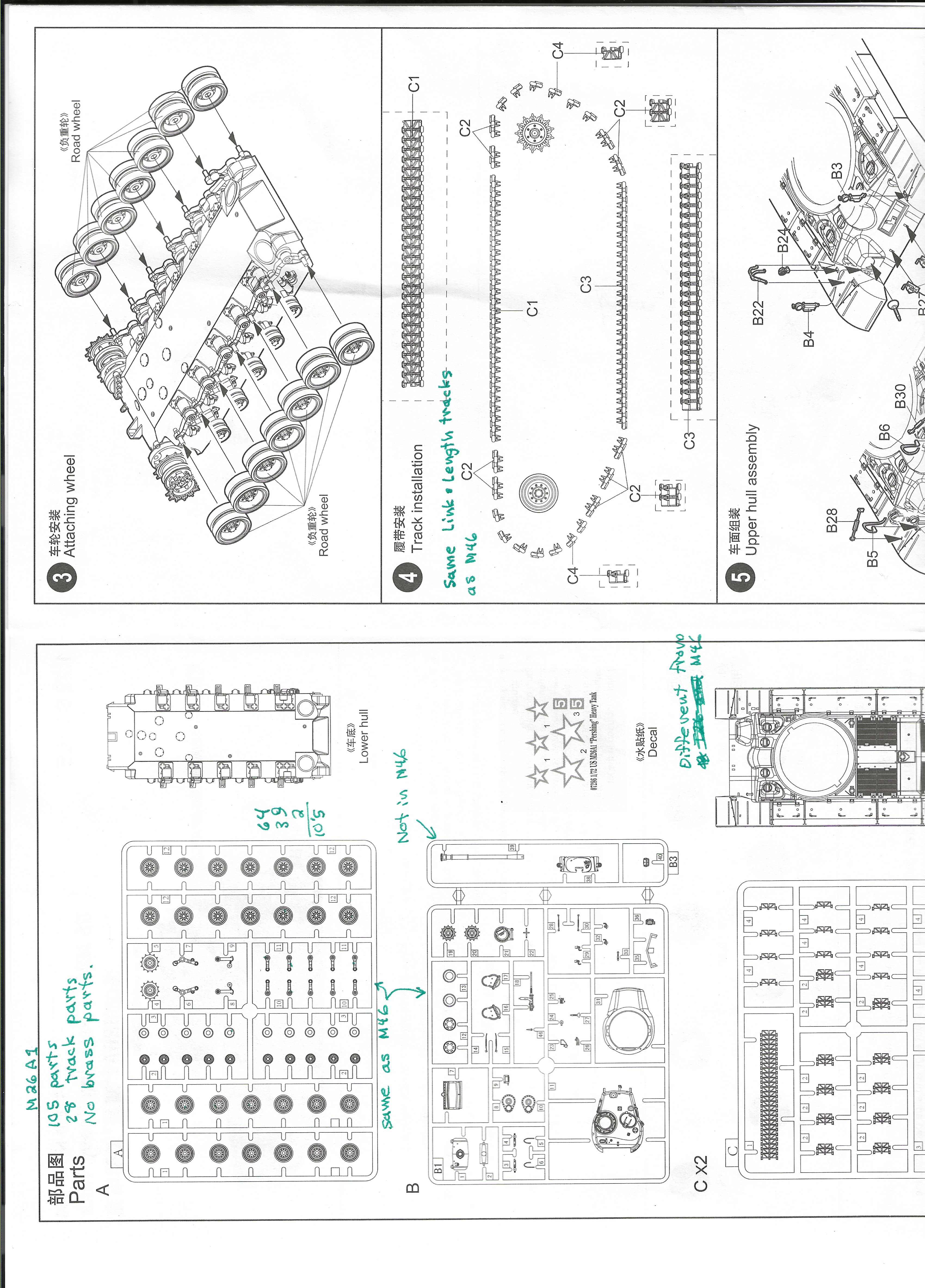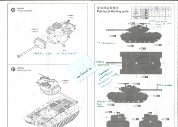 Instructions These two pages from Trumpeter’s M26 kit 7264 show the black & white drawings for painting and the water slide decal markings. The decals are on such light paper that we cannot really see what they look like; they should have used a darker decal paper. These instructions on the decal placement could be better. From the Peddinghaus Decal sheet for the Pershing these markings with the black panther head are identified as for an M26 that served with the 18th Tank Battalion of the US 8th Armored Division, Germany in 1945. These two pages for M26 kit 7264 show the parts tree and assembly of the wheels and torsion bar suspension. I think it is great that we have separate torsion bar arms so we could potentially articulate the arms (parts A10 & A11) and roadwheels (parts A1, A12) over rough ground. The lower hull here is identical for M26A1 kit 7286. Above