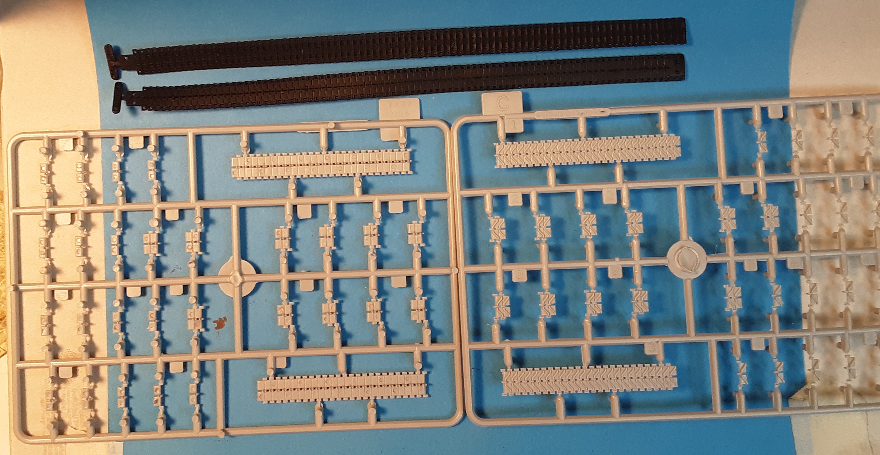 round plate. Sprue-B1 at right and B3 at left, are in the M26 and in the M26A1 kit and hold the turret and some suspension parts. Sprue B3 at far left holds the rear engine plate (part-B38), the gun barrel for the M26 with double-baffle muzzle brake (part-B37), and the gun barrel with the single-baffle muzzle brake and bore evacuator (part-B39) for the M26A1 and the M46. Sprue-B3 is not included in the M46 Model kit 7288. I am pleased that at least the commander’s hatch can be posed open though the loader’s hatch is closed. The lifting rings on the top-front and rear-sides of the turret are solid nubs; for a better display model, we may want to replace these with copper wire. Sprue-A is common to the M26, M26A1 and the M46 tank kits, and holds the roadwheels (parts A1 & A12), torsion bar suspension arms and some sprocket parts. The separate suspension arms (parts A6, 7, 10 & 11) allow us to articulate the wheels and track over irregular ground if we wish. Remember when modeling the tracks that this is “live” track so would not have any sag like we see in WW2 German and Soviet tank tracks. Below is a close-up of the track showing good detail for both types. Both appear to be all metal track. The band track used on the M26 I believe to be the T-82 type. The link and length track used on the M26A1 and the M46 are the T-80 type. On the inside face of the hard plastic link & length track are many ejector pin marks that we should fill in as some will surely be visible after assembly.
