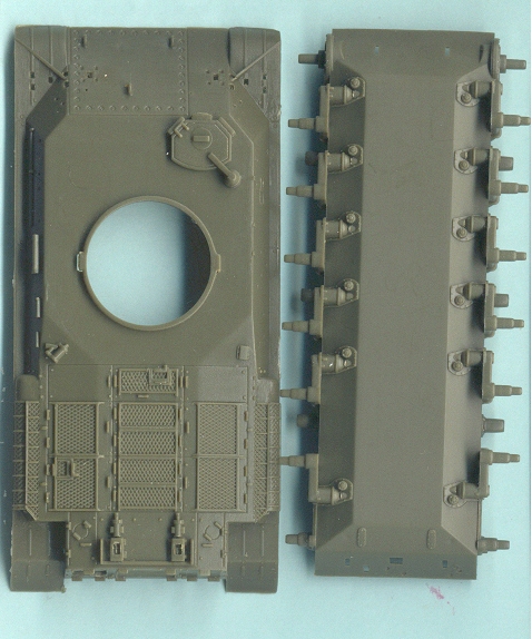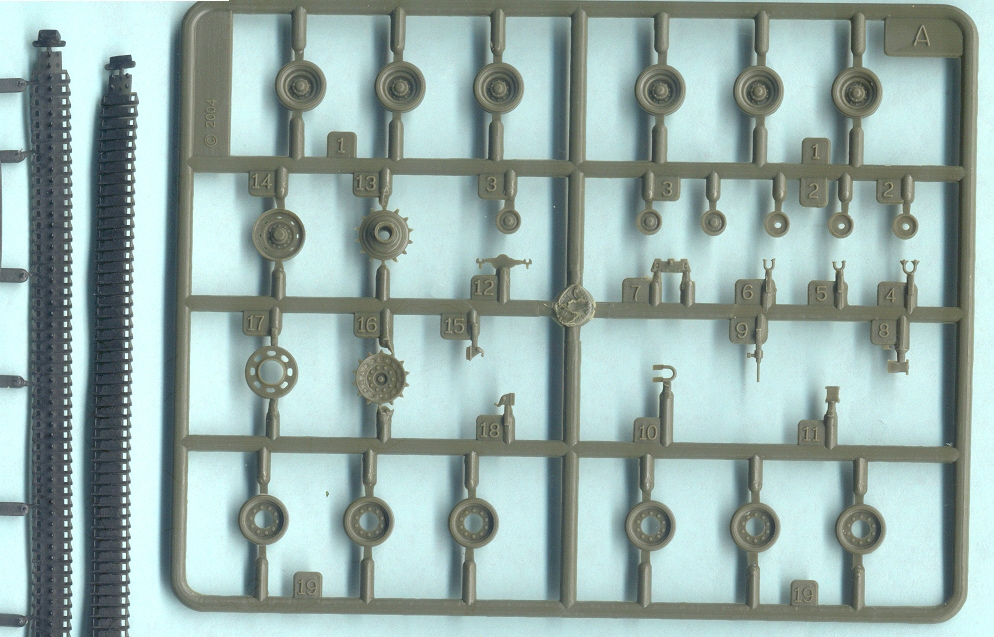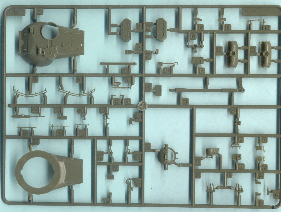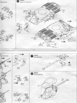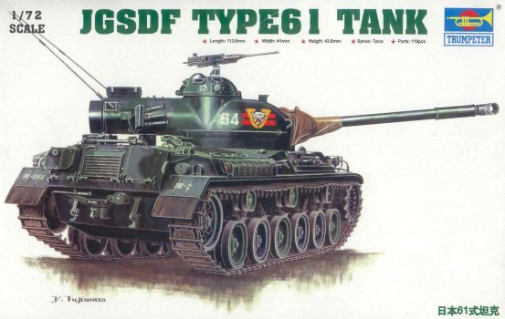 After WW2 and the Korean War the western allies saw the need for Japan's rearmament. The US M47 tanks available were found not suitable so the Japanese Ground Self Defense Force (JGSDF) developed an indigenous design. In the 1960's Type 61's were built and only served with the Japanese. None were exported to other nations, and none saw actual combat other than perhaps against Godzilla and Mothra. This tank and its replacement, the Type 74 are among my favorite cold war era tanks. Looking at it we can see the influence and, at least superficially, theresemblance to the M47 Patton tank. Examining the tank closely we can see many unique features. The Box Art (or what is supposed to be inside) Trumpeter typically shows a photo of the built and painted small-scale model on their box covers. I find it refreshing to find a very nice painting of the vehicle featured. The vehicle appears finished in a gray and green camouflage pattern with white makings on the fenders and very colorful marking on the turret for the 8th Division 8th Tank Battalian according to references. Atop the turret we see a unique dome-shaped commander cupola with what appears to be a 50-cal. AA machine gun mounted. The cupola has protrusions coming out the sides which I suspect are for a stereoscopic rangefinder. (This can be better seen on the scan of part B36 on Sprue B below.) The turret is a cast type with a long bustle in the back, like the M47. There are smoke dischargers and a long antenna mounted on the bustle side and a long grab handle. The gun mantlet has a canvas weather cover. The turret is armed with a 90-mm gun with bore evacuator and the T-shape muzzle break at the end is similar to the US M48 tank. Near the rear of the mudguard we can see a muffler and engine exhaust covered by a mesh screen. The suspension consists of six rubber tired roadwheels like on the Patton tank. There are three return rollers per side. Unlike the Patton tanks, the drive sprocket is at the front of the tank. The track appears to be all steel tread. Notice the rubber mudflaps on the rear fender. The Instructions Trumpeter gives us the standard exploded-view type instructions with 14 progressive steps. I've been warned about how thin the turret wall is and it should be handled carefully like a vacuum-formed plastic kit. At upper right of this page are the painting and assembly guide for the two crew figures. At the bottom of the scan we see a little tan colored string. Trumpeter gives this to us to simulate the towing cable as shown wrapping around the hull front in Step 12. If you look closely in good light at the hull sides you'll see faint bumps that are supposed to be the cable loops that the string ends attach to. We are better off replacing these with some cable loops taken from another kit. There are markings for what looks to be five or six different Type 61 tanks on the water-slide decal sheet but a painting and marking guide in the instructions for only one Type 61; online references should help with the rest. The markings are bright, colorful and in register. The parts There are about 117 green color, injection-molded styrene plastic parts on three sprue and the two separate hull parts. Molding quality looks top notch. This is not a rebox of the Fujimi kit Type 61 tank which I have been informed by friends is 1/76 in scale, while I've been assured this Trumpeter kit is 1/72-scale. The lower hull is slide molded with all the torsion bar suspension arms molded in place, which eases assembly. With a fine saw and a little surgery we could cut off and articulate some of the arms to pose the model over rough terrain. There is not much detail such as access hatches on the hull belly. Looking first at the upper hull part we see the single hatch for a driver, molded closed and with three periscopes. There is a large square on the glacis with bolts that I presume to be an access hatch for the transmission and breaks. The hull appears welded but I see no weld seams. At the rear is the engine deck with nice detail. Sprue B contains the turret parts B1 & B30, with fine turret handrail parts B5 and B6. At lower left is the commander's cupola with an open hatch (part B38). If we mold the hatch open we will need some interior detail added. I find it odd that Trumpeter supplies two crew figures but there is only one open hatch on the model; this is not a complaint though as I'm am always happy to have extra figures. There is a choice of two sizes of storage box for the end of the bustle (part 2 or part 10). The 90-mm gun barrel (part 21) has an open muzzle so there is no need to drill the muzzle open. There is a choice of two gun mantlets, parts 18 or 19; part 18 looks like it has a simulated canvas cover molded onto it. There are two Sprue-A containing the roadwheels, drive sprocket and idler wheels. Molding looks very good. At far left are the two soft plastic band tracks which looks to have decent outer detail and it has track guide teeth. There is no inside surface link detail and the track are very thin so Trumpeter could have done much better here with the tracks. Conclusions This appears to be a very nice rendition of the Japanese Type 61 cold war era tank and we are fortunate to have a unique vehicle as this. Now to digress a little, if Trumpeter can do a rare tank like this, why not modify their M46 Patton tank model kit to produce a much more common and wide serving tank such as the American M47 tank? References I've not yet found any reference books for this particular AFV but Wikipedia and a web search will turn up more than enough information to build this model accurately. Review sample purchased by the author. |