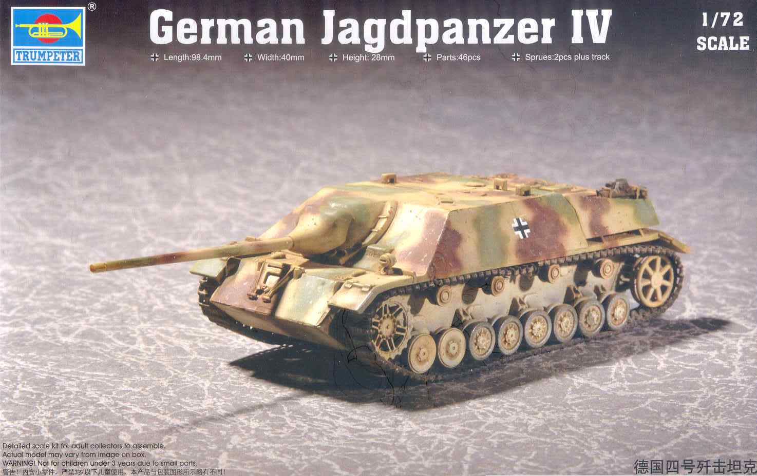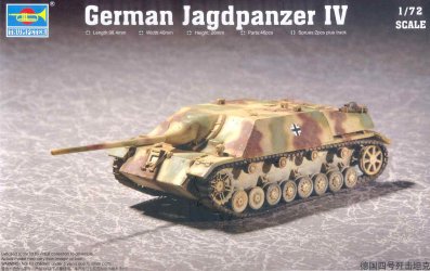 This World War 2 German tank destroyer is based on the Panzerkampfwagen IV tank and is characterized by the low, well-sloped, thick, armored hull. The reference book Panzer Tracts No.9-2 states that among other German AFVs, this vehicle underwent name changes through its production and use. The earlier produced version of this tank hunter, armed with the shorter 7.5-cm Pak 39 L48 gun, was indeed referred to as the Jadgpanzer IV, or fully the Panzerjaeger IV (7.5 cm Pak 39 L/48) (Sd.Kfz.162) Ausf. F. This version (on the box art below) armed with the long 7.5-cm Pak 42 L/70 gun was referred to as the Panzer IV/70 (V) (Sd.Kfz.162). Seeing that this kit includes gun barrels for both versions I don not consider the incorrect title of Trumpeter's kit to be a significant issue.