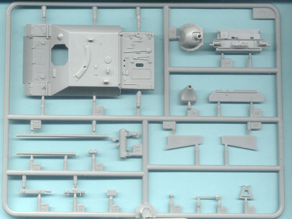 Sprue E contains the upper hull parts. In examining the upper hull, note that the gun mount for the Jagdpanzer IV is offset to the right. I find the engine deck acceptable though engine grill slats are not done as well as the Hasegawa or DML. There is a hole for the periscope gunsight but no actual gunsight included with the model.
