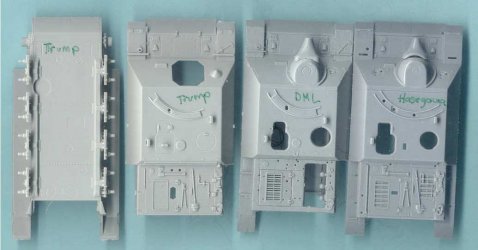 DML and Hasegawa superstructures and chassis both clearly feature the joints for the armor plates but Trumpeter does not.
