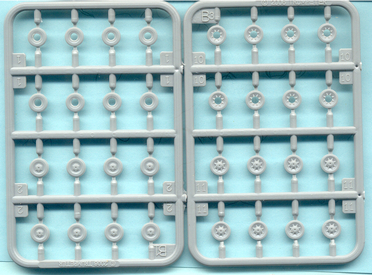 Here are sprues B1 and B3, of which there are two each. B1 (at left) contains eight paired steel roadwheels (B1 & B2) for a total of 16 steel roadwheels in the kit, so there are extras to use with another model. The wheels look fairly accurate.
