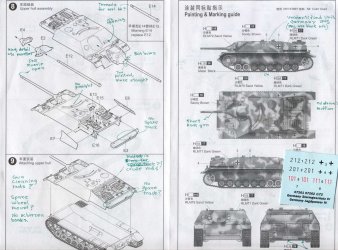 For comparison sake with the Trumpeter at left, I've included partially assembled superstructures from the Dragon Jagdpanzer IV (center) and from Hasegawa (far right). Overall dimensions of the three kits look very close. In response to questions about dimensions and angles of the Dragon and other Jgdpz IV kits, I took some measurements and compared them to Hilary Doyle's plans in Panzer Tracts. None of the three superstructures were perfect compared to Doyle's plans. For example, Hasegawa's roof width is close to true but its height is 0.75-mm too high. Trumpeter's Jgdpz IV superstructure is a little high but pretty close in width.