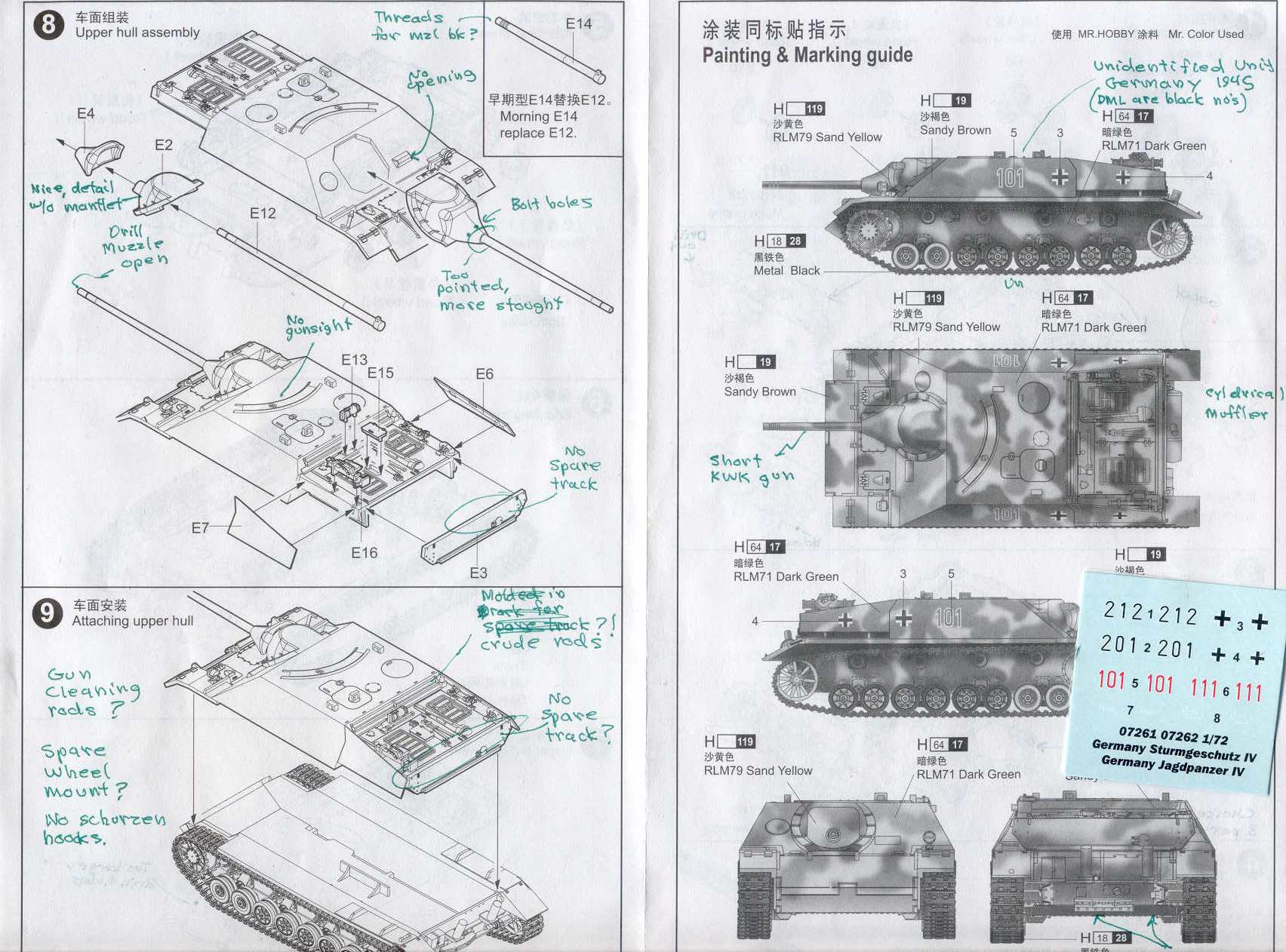 In Step-9, showing final assembly, we see that certain common features of the Pz IV /70 (V) are missing from the Trumpeter model: no side skirts or mounting hooks, no rooftop gunsight, no spare wheels mounted on the engine deck, no spare track mounted on the rear engine plate.