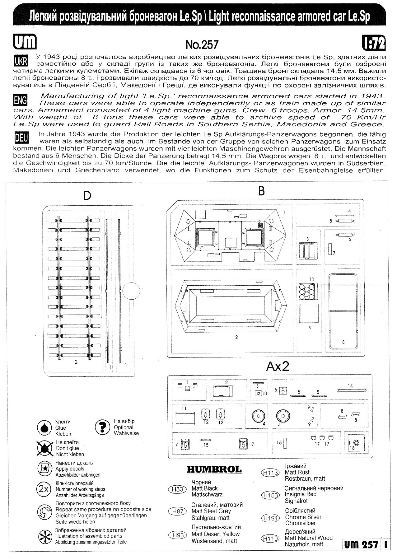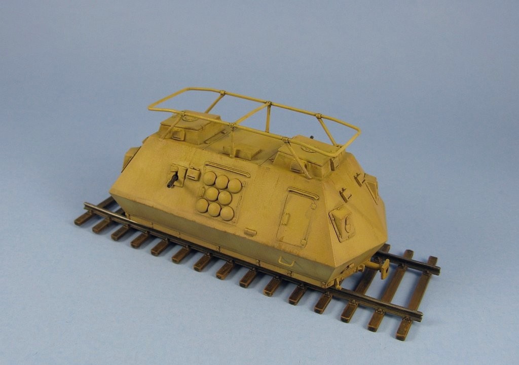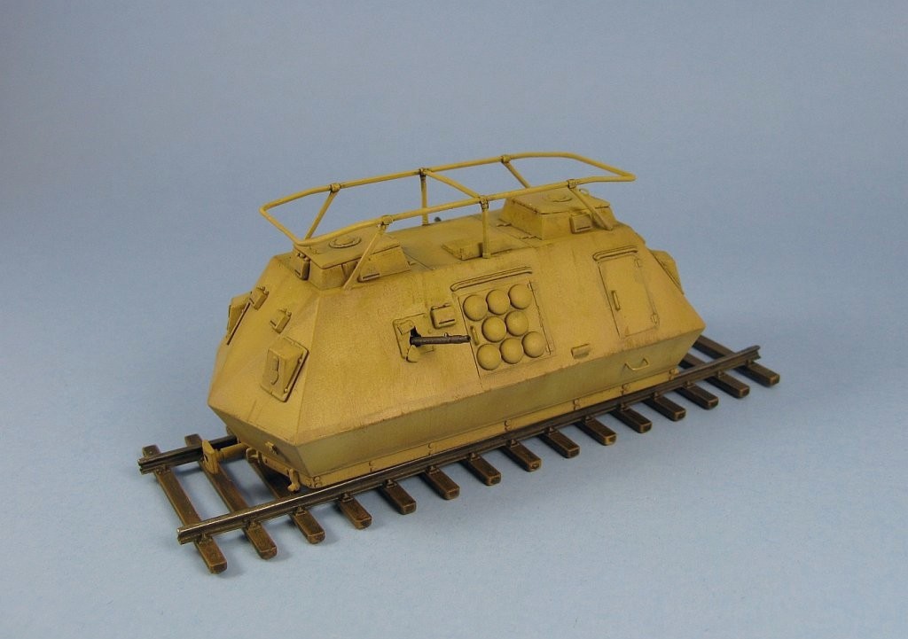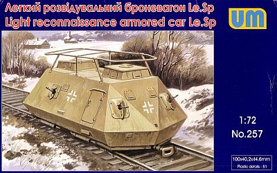 Railroads are one of the primary war time movers of men and materiel for over 100 years. Protecting them is vital if an army wishes to maintain an efficient and secure supply line. In 1943 the Germans started work on two versions of motor driven railcars (aka draisines) for reconnaissance and protection duties - a small lightly armoured version (leichte Schienenpanzer - le.Sp.) and a heavier armoured version (schwere Schienenpanzer - s.SP.). These would be independent vehicles, each with their own motor to allow them to travel singly, hooked together in sub-groups, or as a complete train, allowing operational flexibility and the ability to continue the mission should one of the cars become damaged. Steyr was the designer for both versions. The leichte Schienenpanzer had armour of 14.5mm. The hull had sloped sides, with doors on both sides and covered air intakes on one side. There were two hatches on the roof, one at each end. The vehicle had no fixed weapons. The hull had 6 MG ports - two at each end and one per side. Also included was a bed frame style aerial for radio communications. The light weight gave a top sped of about 70kph with a Steyr 76hp air-cooled engine. Driving stations on both ends of the vehicle allowed it to be driven easily in either direction on the rails. Approximately 40 were built and the first were available in the spring of 1944 for anti-partisan operations in the Balkans, where due to its light weight it could operate on tracks that couldn't support heavier trains. As far as I know, UM is the first manufacturer to offer this vehicle in injected plastic.