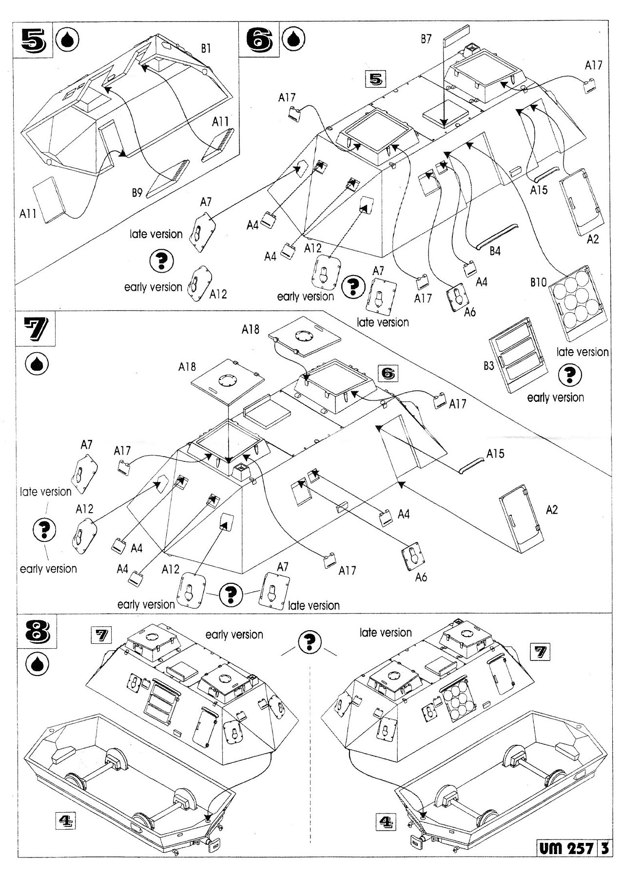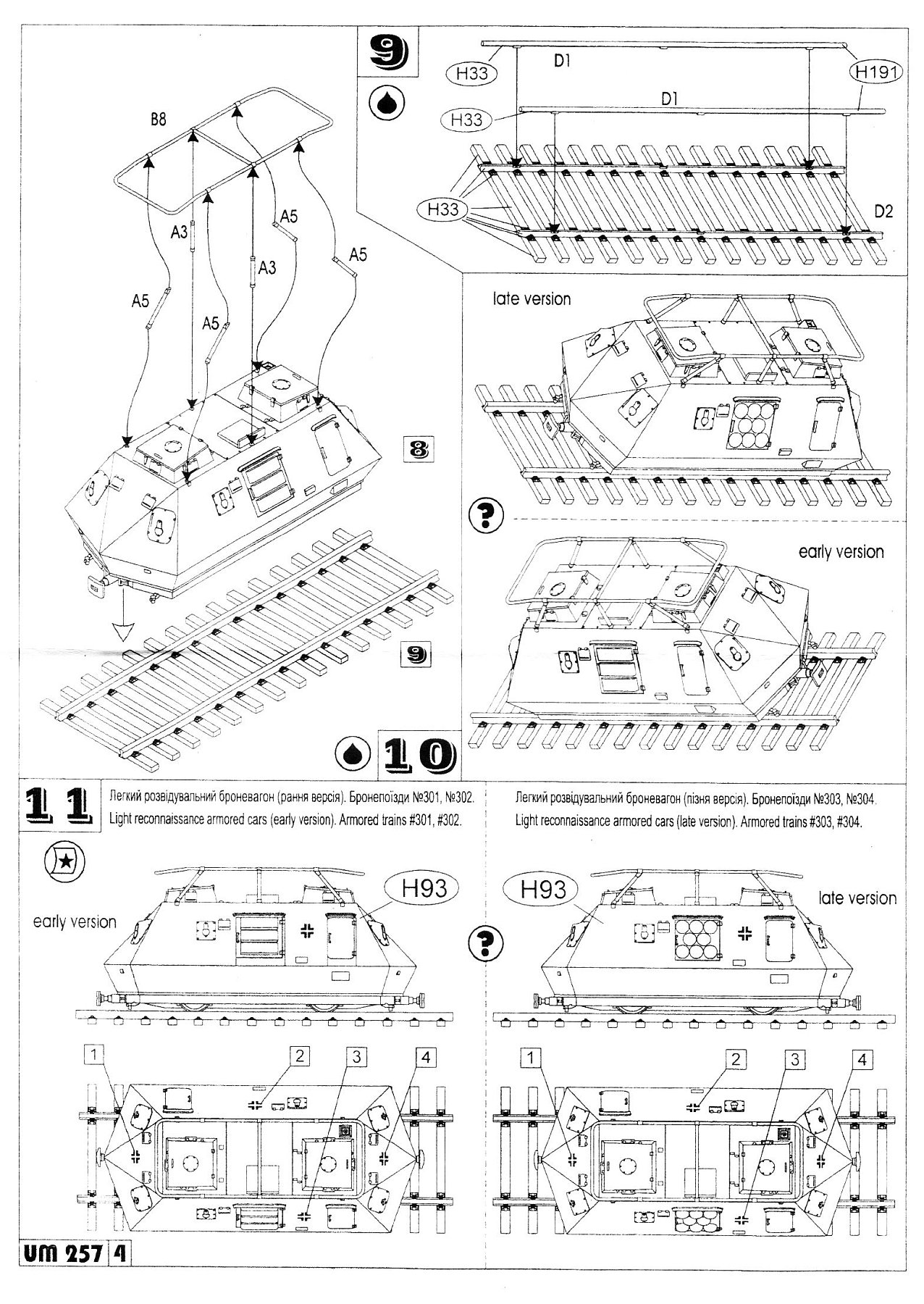 Parts are molded in UM's typical soft, light grey plastic. Flash is minimal and for the most part the molding is well done. There a few spots to look out for where the plastic has some low spots and requires some filling: at both ends of the upper body (part B1) and on the square hatch molded on the hull top (where part B7 attaches to in Step 6). A nice touch is the molding of the upper and lower hulls as one piece units. This removes any chance of alignment problems that you usually get with multi-panel assemblies. For this review, I'll use the instruction sheet as a guide and alter the suggested build sequence to make the construction more sensible. Step 3: Step 9: With some experimentation I found the best approach to the problem was to first glue the wheels to the axles (this is why I suggest the build should start with Step 3) so they can be used as a spacer between the rails to ensure the proper distance between them as they dry. To attach the upper part of the rails to the lower half on the ties, first glue the end points, then glue the remainder of the length between the ends. I strongly suggest using a fast acting liquid glue for this, such as Tenax 7 or methylene chloride (MEK). And be very careful, because until all the parts are attached and set, the rail is quite flimsy and easy to bend or break. After everything has dried, then you trim and sand off the sprue attachment points, and while you're at it add some grain to the featureless wood ties by scraping them with the tip of a hobby knife. There are a couple of oddly placed reliefs on the tracks that siamese with the rails. These should be removed. Step 4: Steps 5, 6, 7 & 8: Parts are provided to build one of two versions, differentiated by the engine covers and gun ports. The early version uses part B3 for the engine cover and parts B12 for the gun ports. The late version uses part B10 for the engine cover and parts A7 for the gun ports. I chose to do the late version primarily because the gun ports were molded better. The early gun ports were marred by prominent sink holes that would be next to impossible to fix without totally destroying the detail. The front and rear gun ports (parts A7) have a small bump on their backside that is intended to slot into a small recess in the hull, but the recess is not present. I had to trim the bumps and sand the bottom of the ports flat in order to mount them to the hull. Doors come as separate pieces (part A2) as opposed to molded directly to the hull as found on the other German draisines offered by UM. Why this was done I have no idea. All the separate door parts accomplished was add more work to the build. They didn't fit flush so sanding was needed to thin them enough to remove a step that would have resulted if they were added as supplied. All of the view ports are problematic. The set that is located beside the gun ports on the lower hull are just a smidge too short lengthwise. The small indent in the hull where they mount is slightly larger than the covers so you have to decide at which end of the cover you want to add your filler. I chose the bottom side because it is straight and I could sand the filler without worrying about removing the molded on hinges. The small ports (part A17) that mount to the sides of the casemates on the top hull are either too large or the casemates are a bit too short. Either way they pretty much span the space between the hatch cover and the top of the hull which isn't what I see in my photo references. Hull vision slots are marked as part A4 in Steps 6 & 7 but they are actually part A1. A4 is the part number for the wheels. At this point I also added some missing detail. The kit has no front and rear headlight covers plus their hinges, so some round covers were punched from a sheet of plastic and hinges were excised from a kit found in the spare parts box. I added most of the missing rivets to the lower apron that runs around the perimeter of the lower hull. The exhaust pipe ends were drilled out. The two gun ports on the left and right side of the hull were opened up and new covers were made to accept a pair of MGs I planned to add later for some visual interest. Foot rungs fashioned from thin wire and added to the lower hull. After all this, the two hull halves were joined. Step 10: Steps 1 & 2: Painting: References: Review sample purchased by the author. |