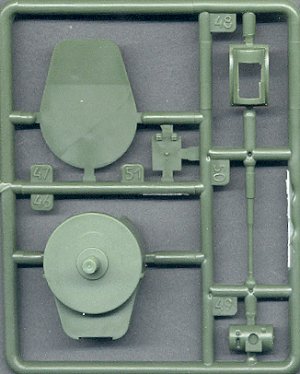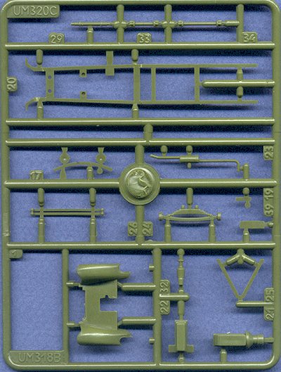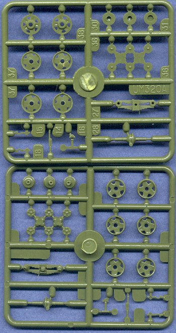 It is fairly complex, yet easy to assemble. There are many small and highly detailed parts, however, UM seems to have skipped a bit by failing to provide all the rivets that were very prevalent on this series of armored cars. Just look at the box art to see what I mean. The body and turret of this kit are completely lacking in rivets. Of course, the reason is because of the way the body was molded, and the difficulty of molding detail on vertical surfaces. I would have been happier had UM decided to make the hull from separate panels, as Mirage or RPM do with their kits, so that the rivets could have been molded on flat surfaces.